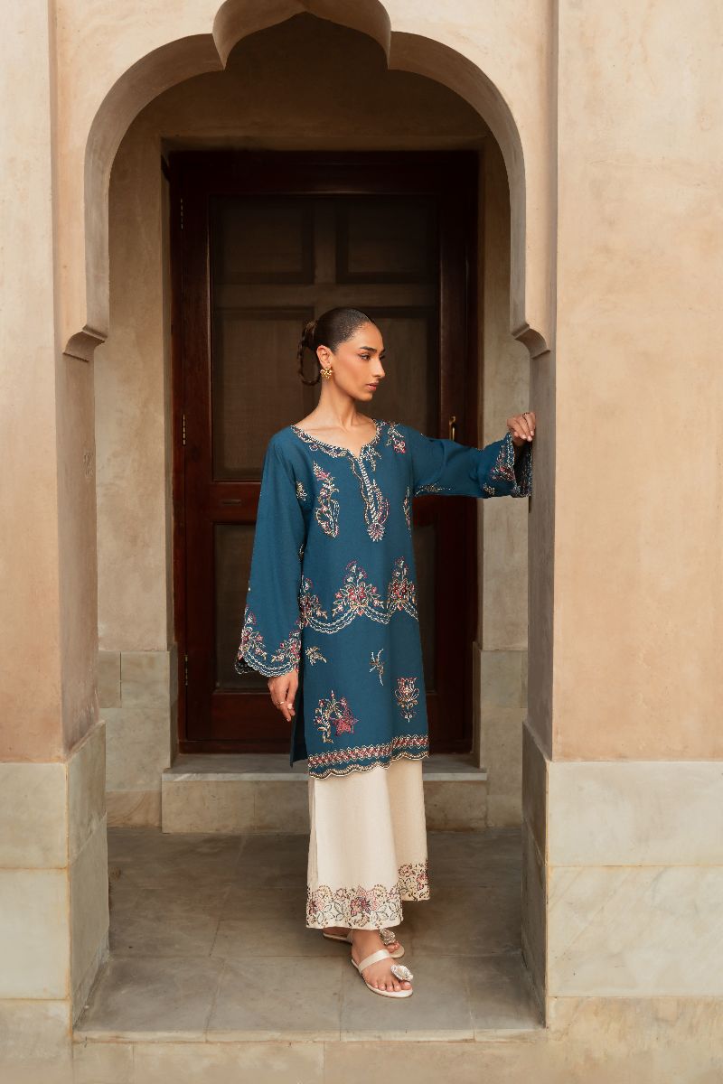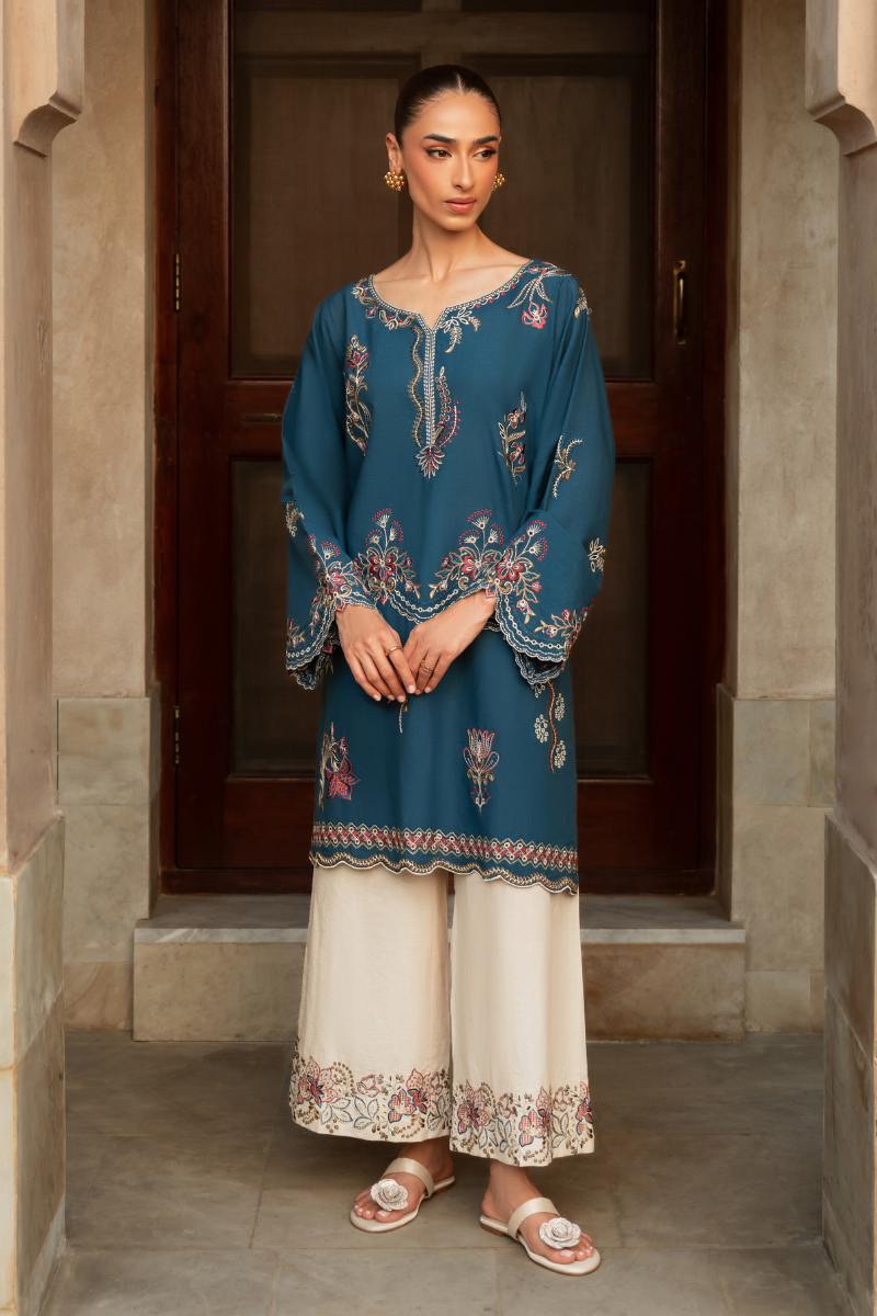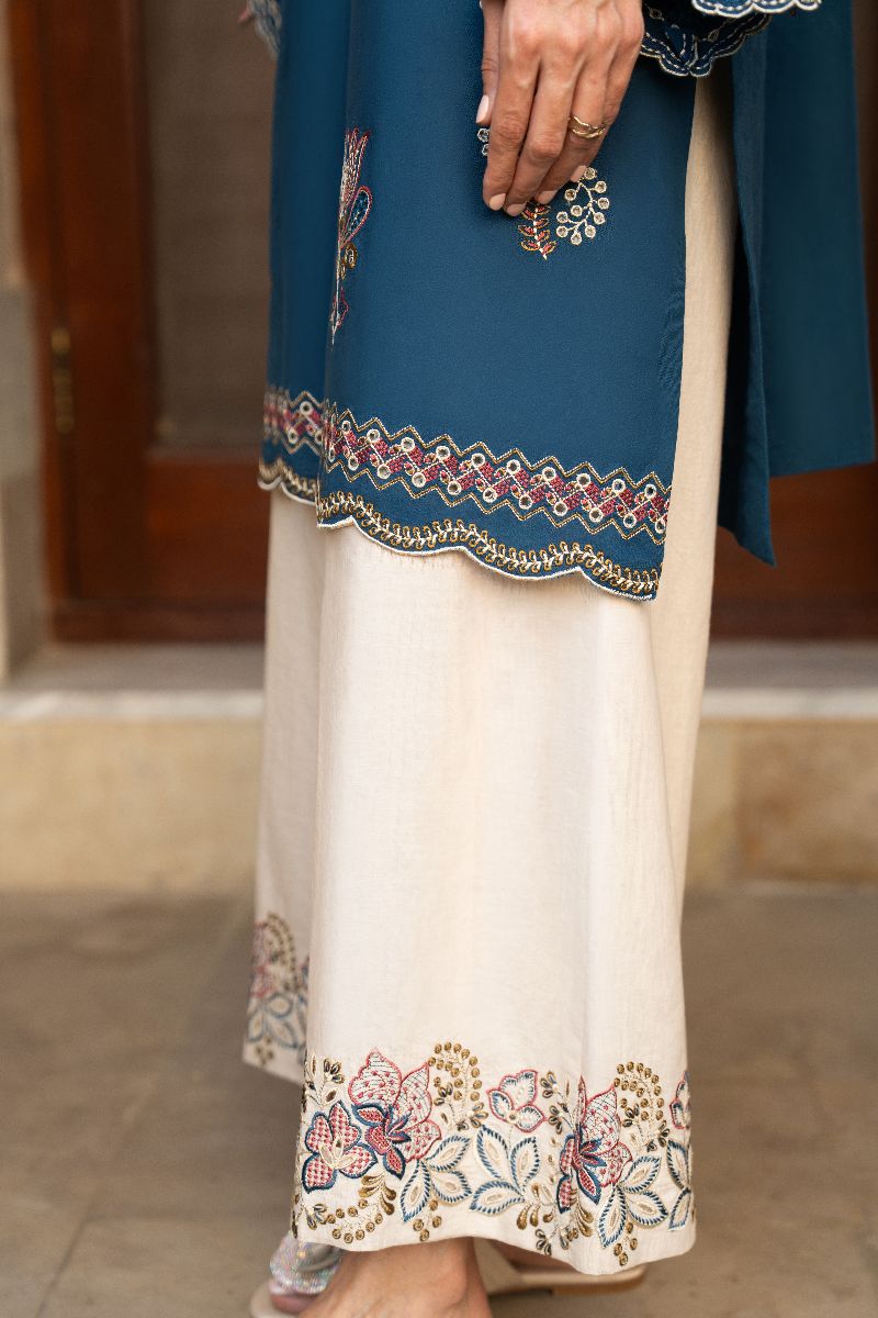 Faylinn kurta features intricate embroidery inspired by Contemporary motifs. The fluid silhouette offers ease, while delicate border frame the piece with quiet sophistication. Style it with our off white crafted culottes trouser for an elevated look.