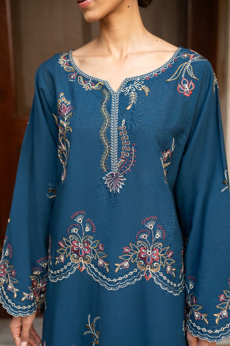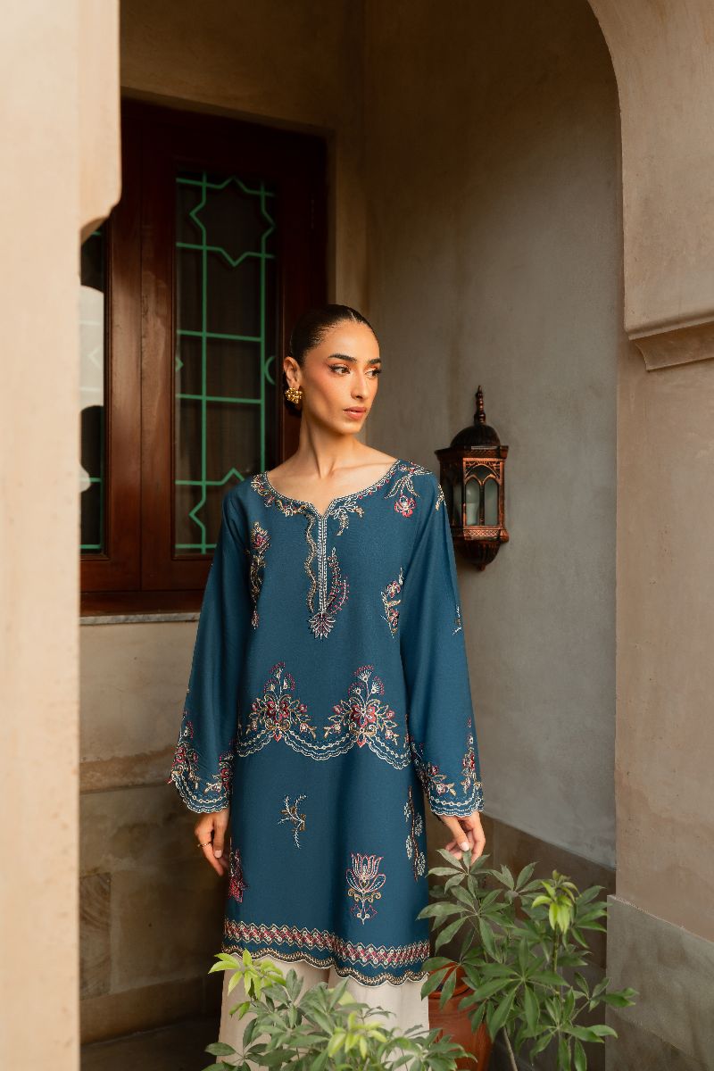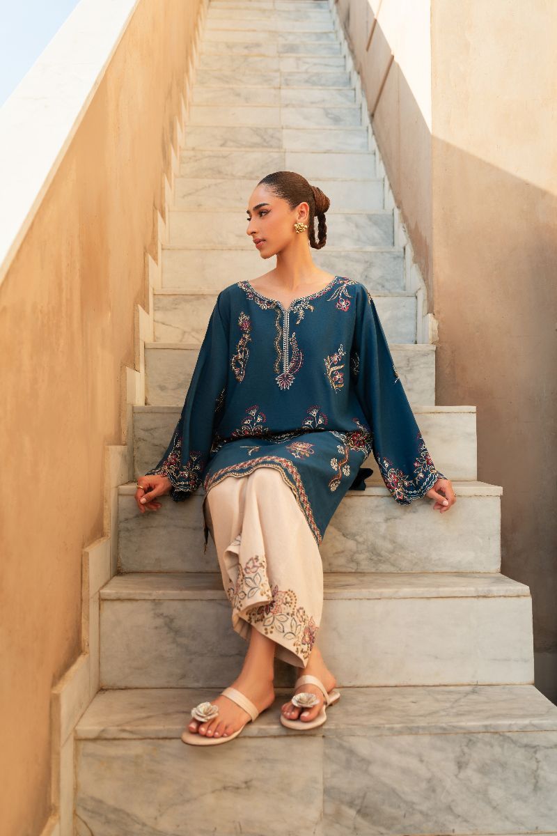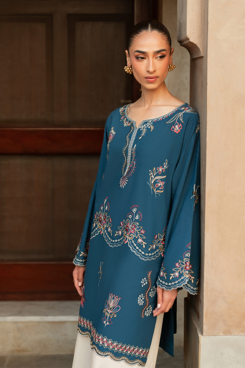 Faylinn kurta features intricate embroidery inspired by Contemporary motifs. The fluid silhouette offers ease, while delicate border frame the piece with quiet sophistication. Style it with our off white crafted culottes trouser for an elevated look.