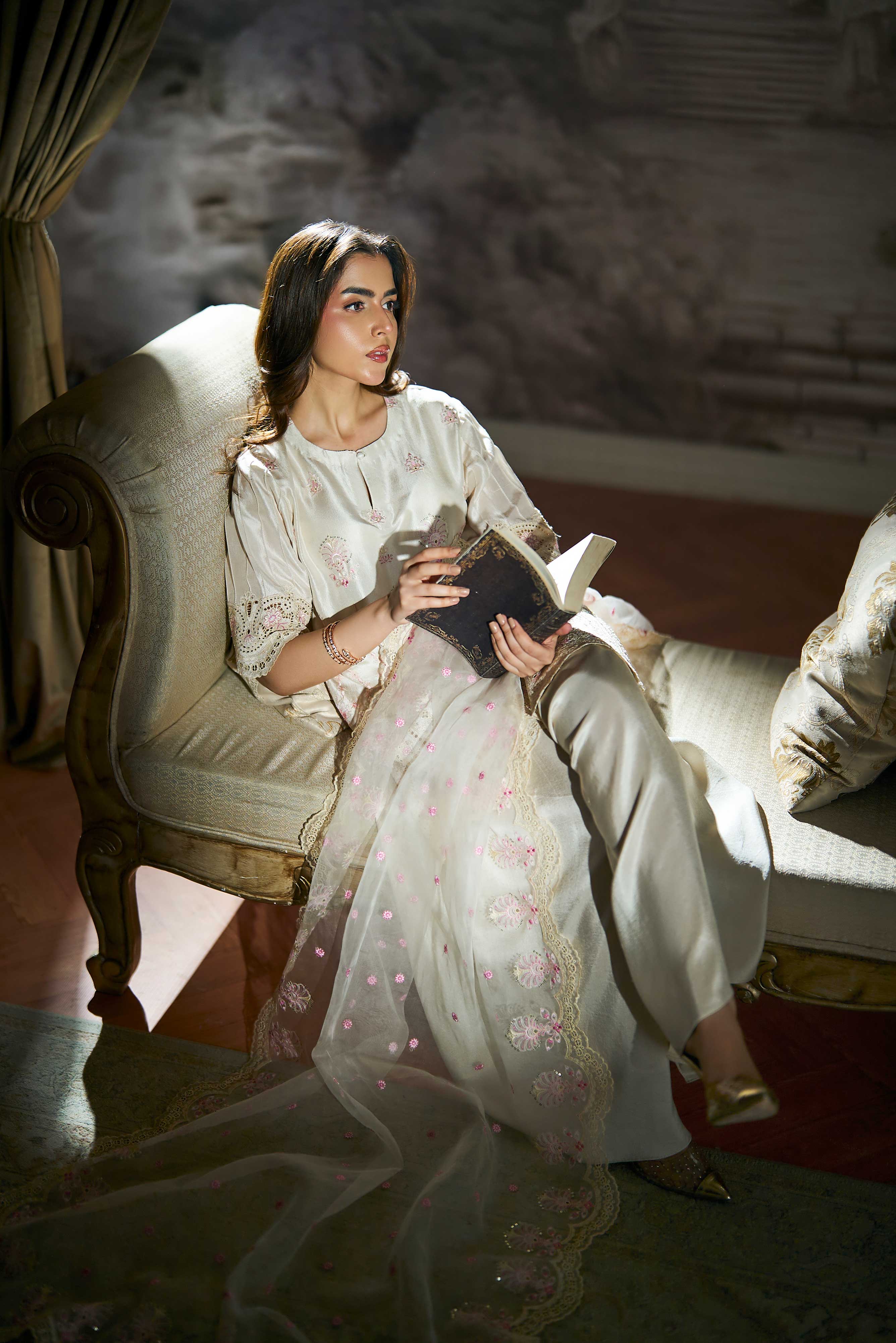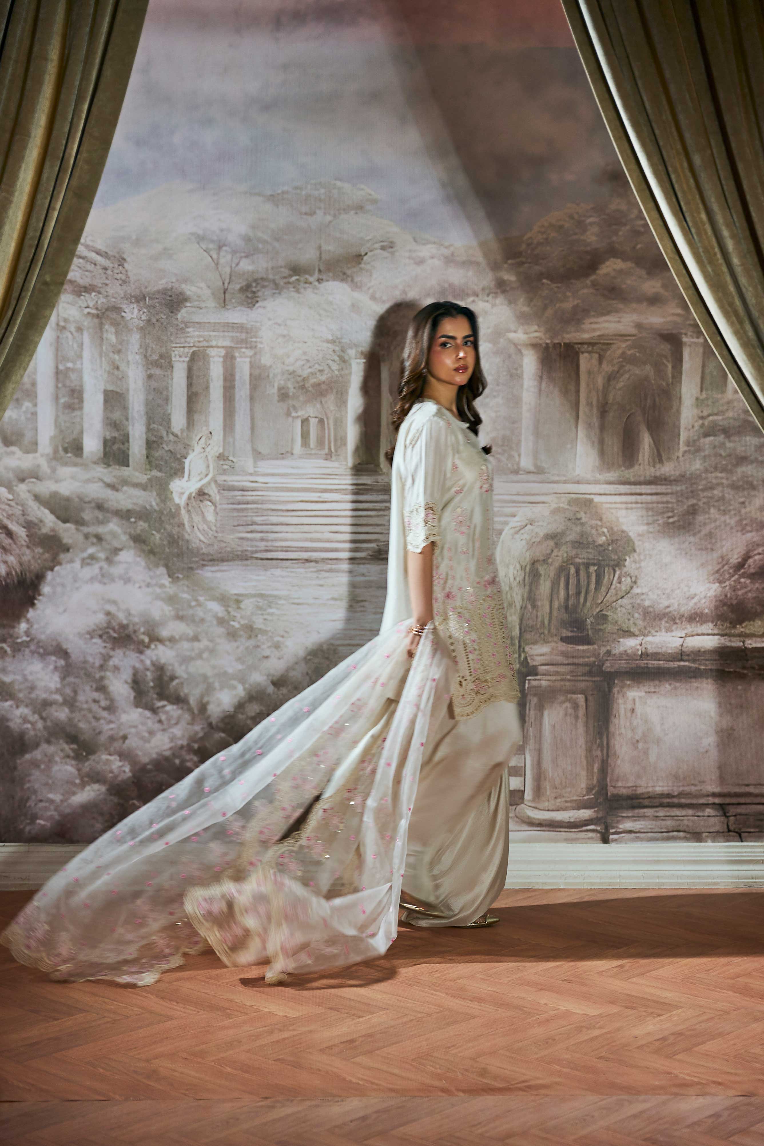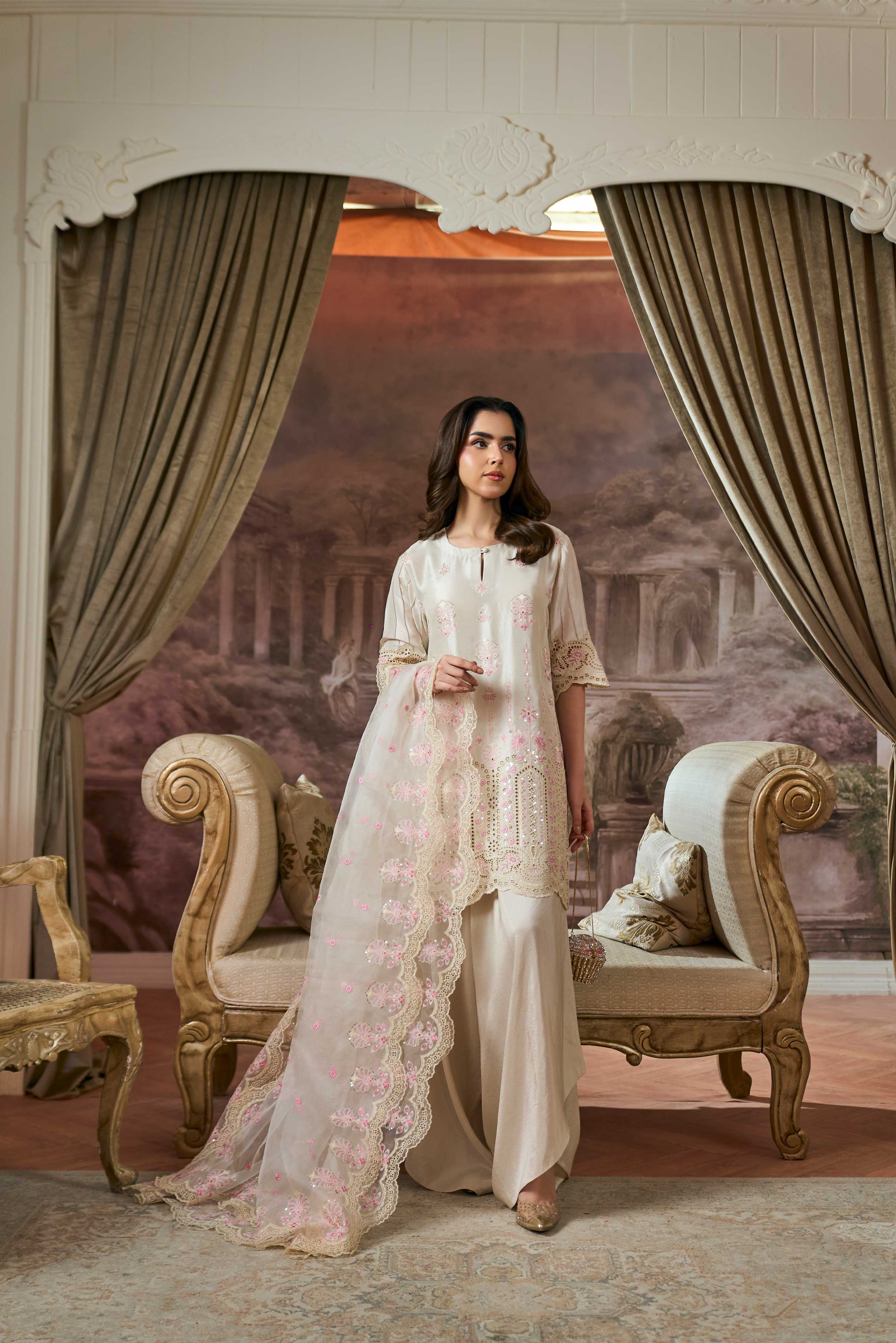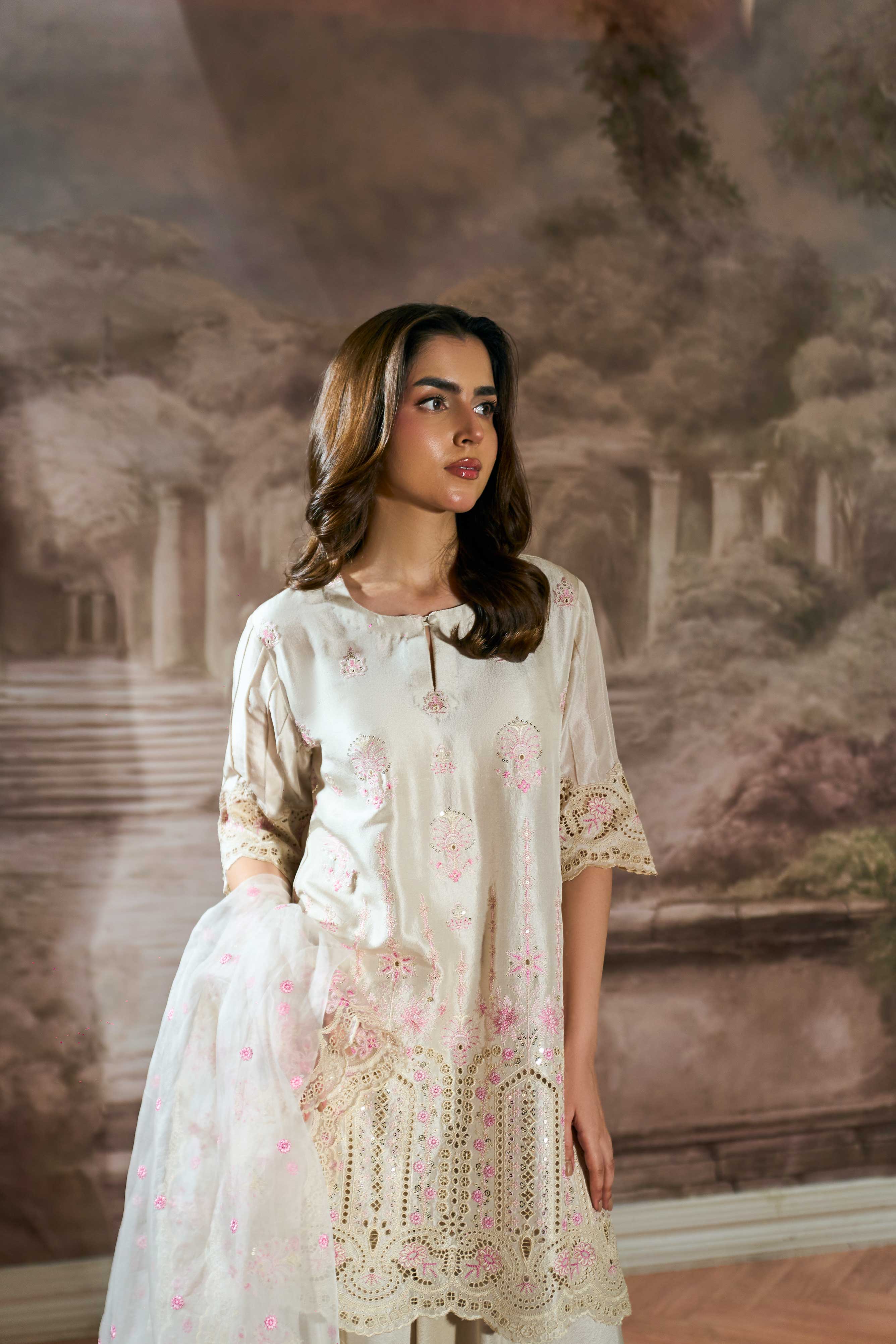 Delicate, dreamy, and decadently detailed, this outfit captures the essence of timeless femininity. This 3 piece stitched silk outfit features intricate thread and eyelet embroidery in soft blush pink, beautifully balanced on an ivory silk base.