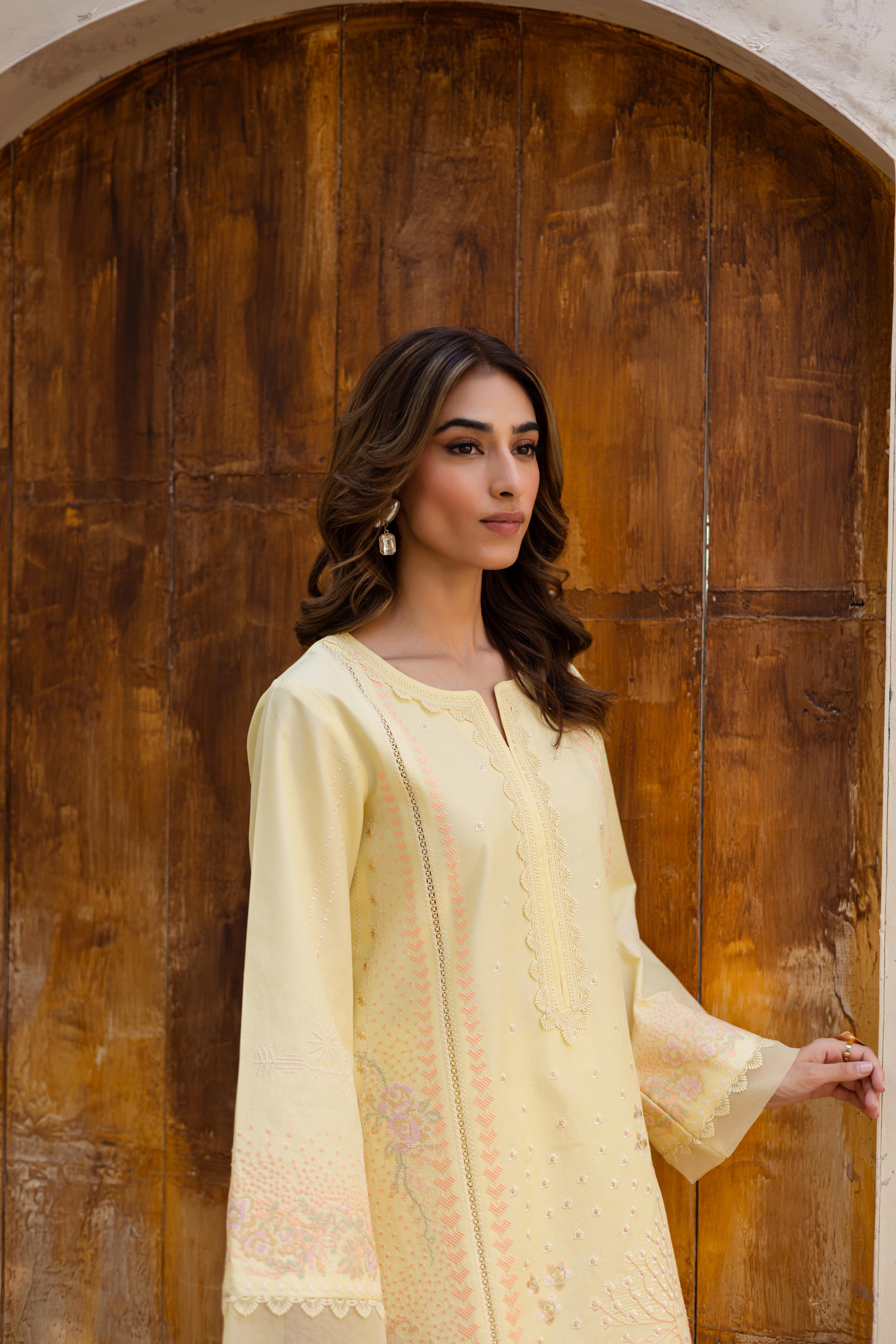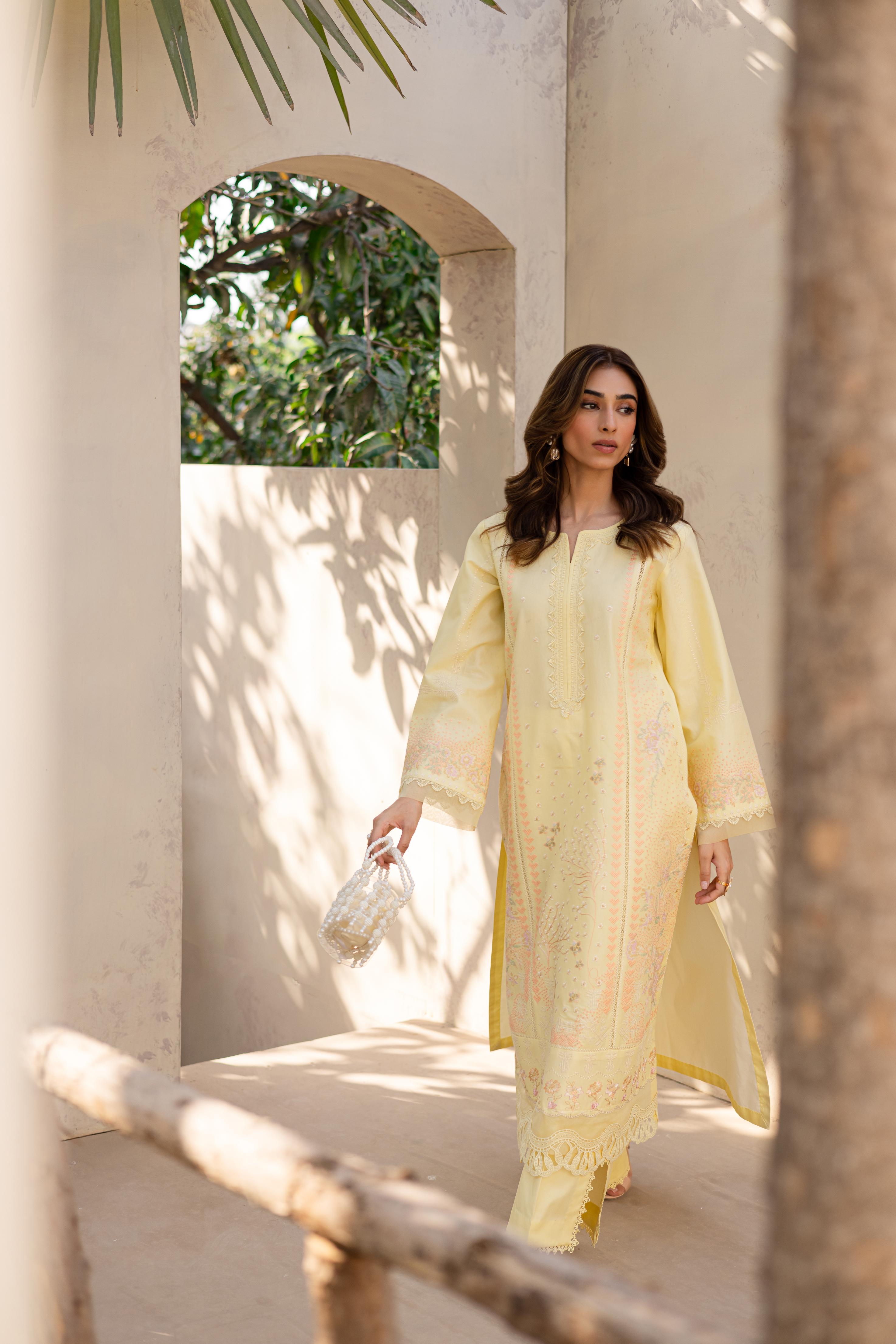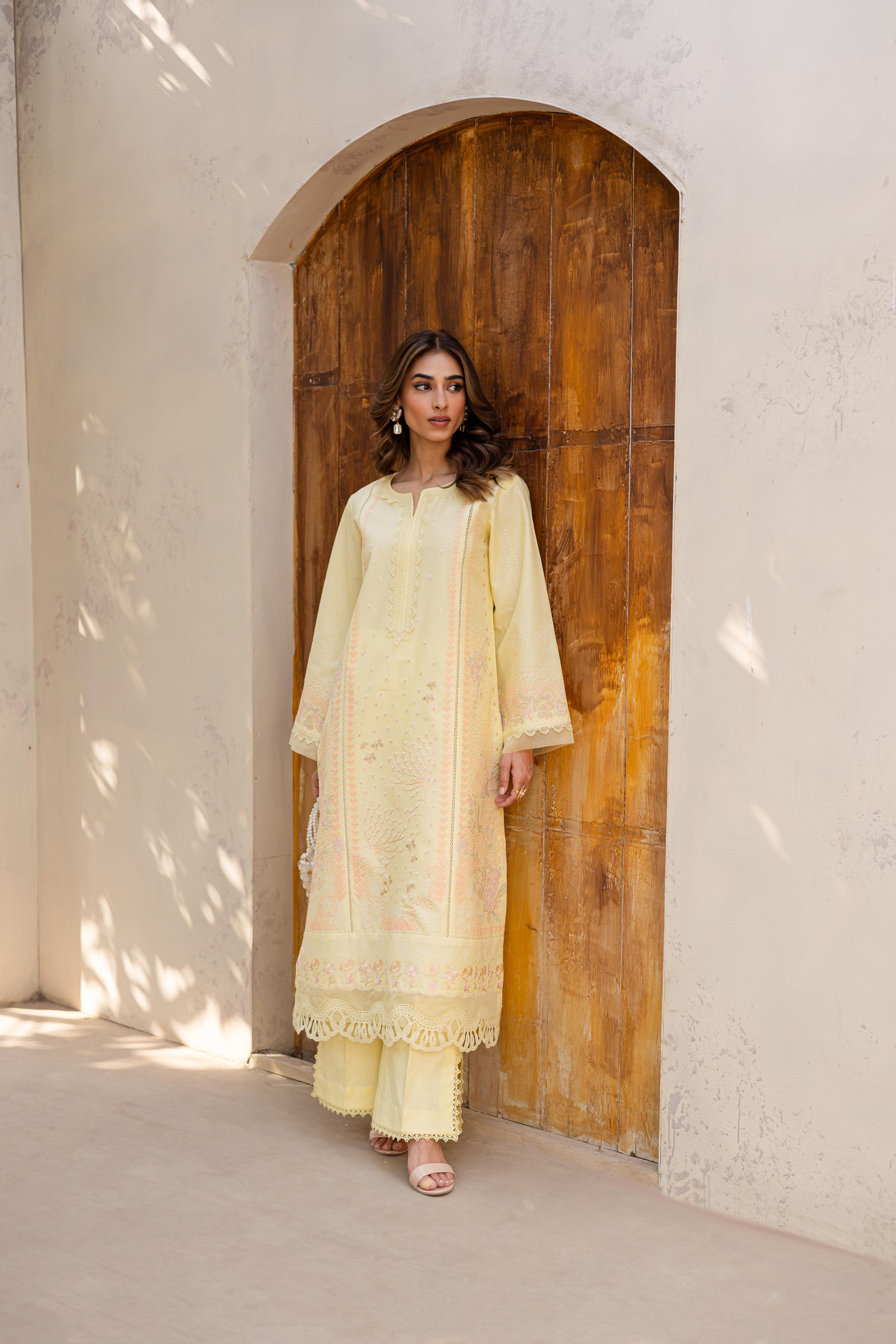 Bathed in the softness of lemon yellow, this embroidered lawn outfit captures the essence of summer bright, breezy, and beautifully balanced. Delicate threadwork in soft ivory and pastel tones graces the fabric like morning light, subtle yet striking. Paired with a matching embroidered chiffon dupatta that flows effortlessly and a coordinated trouser for a refined finish, this look is a gentle reminder that summer dressing can be both vibrant and serene.