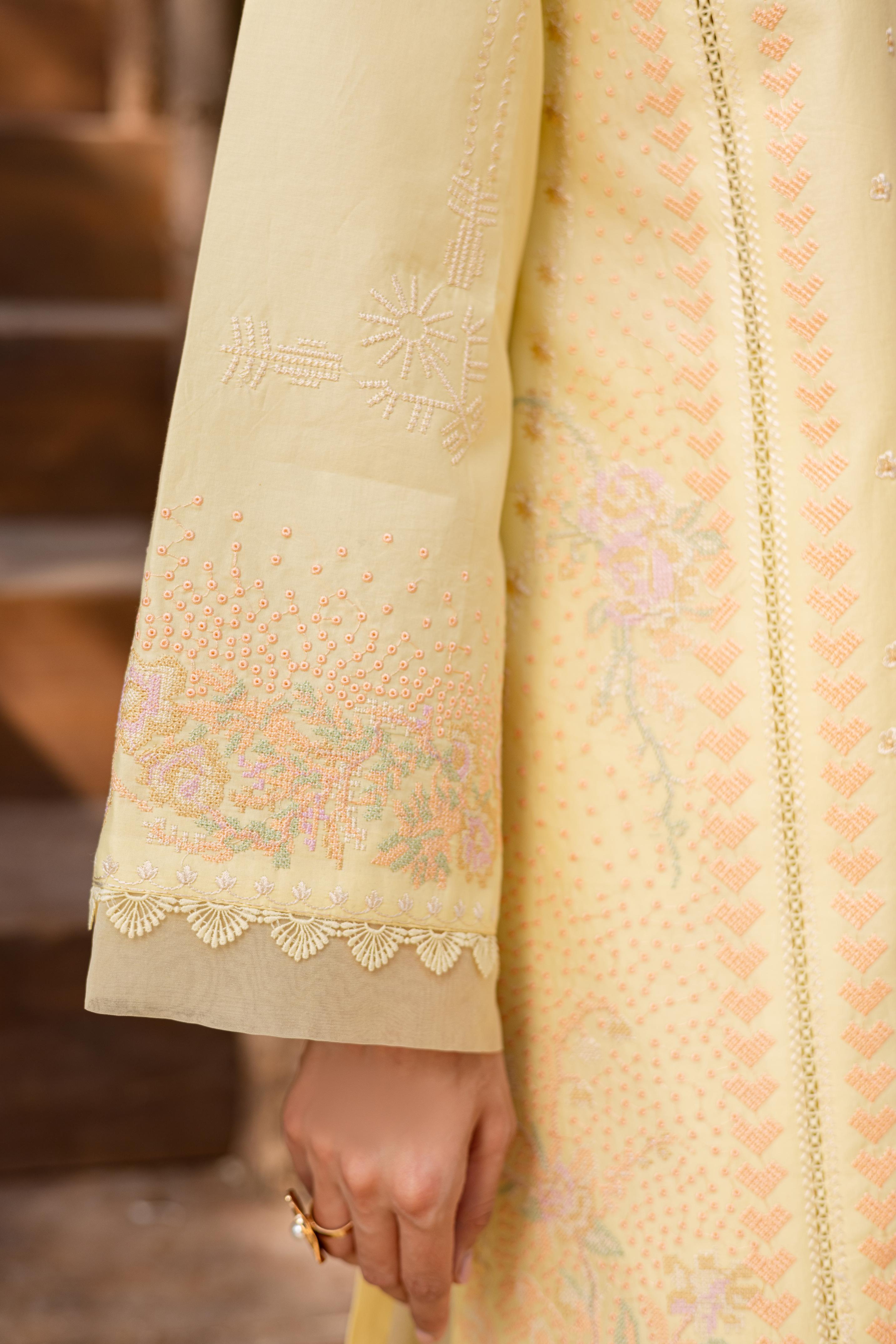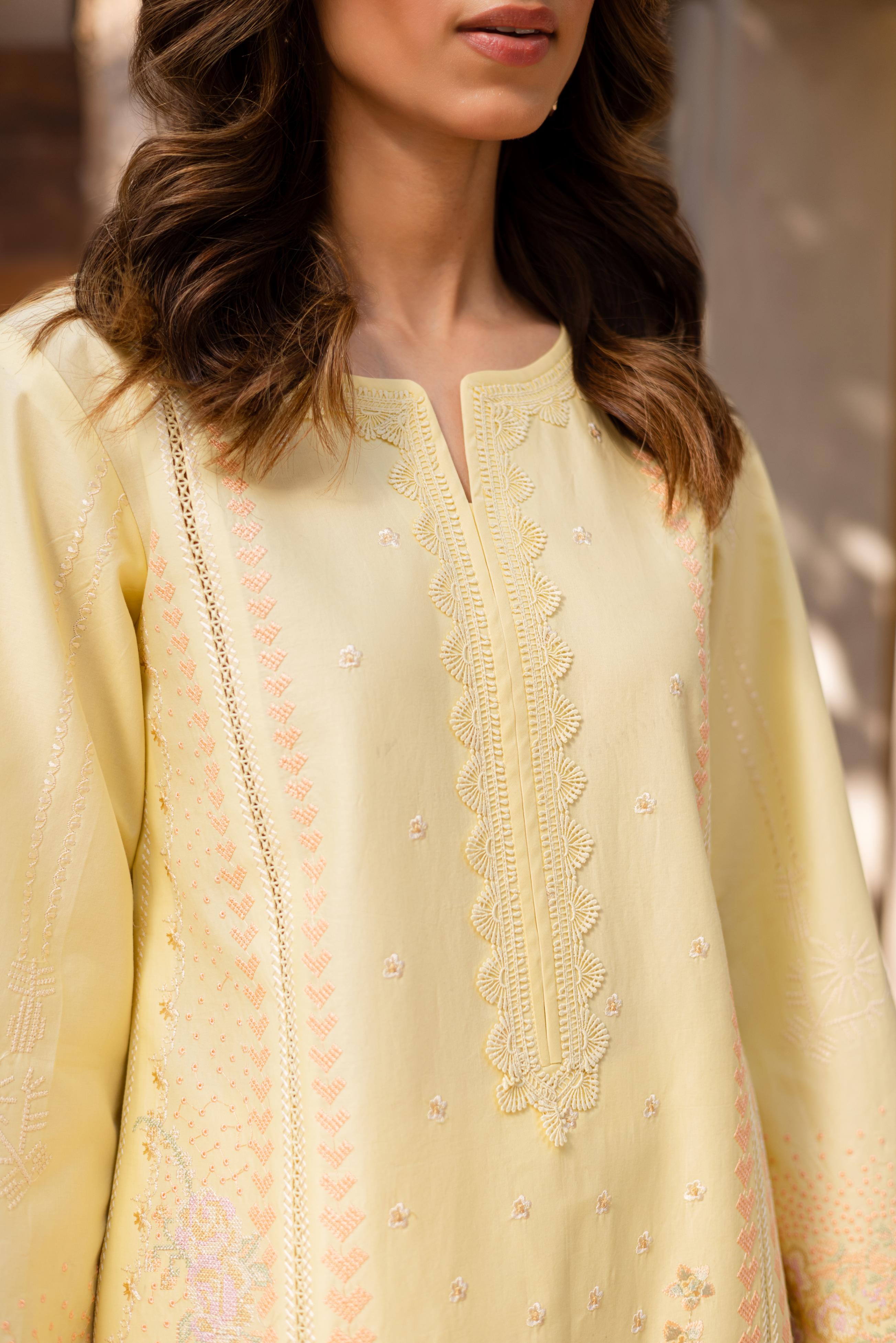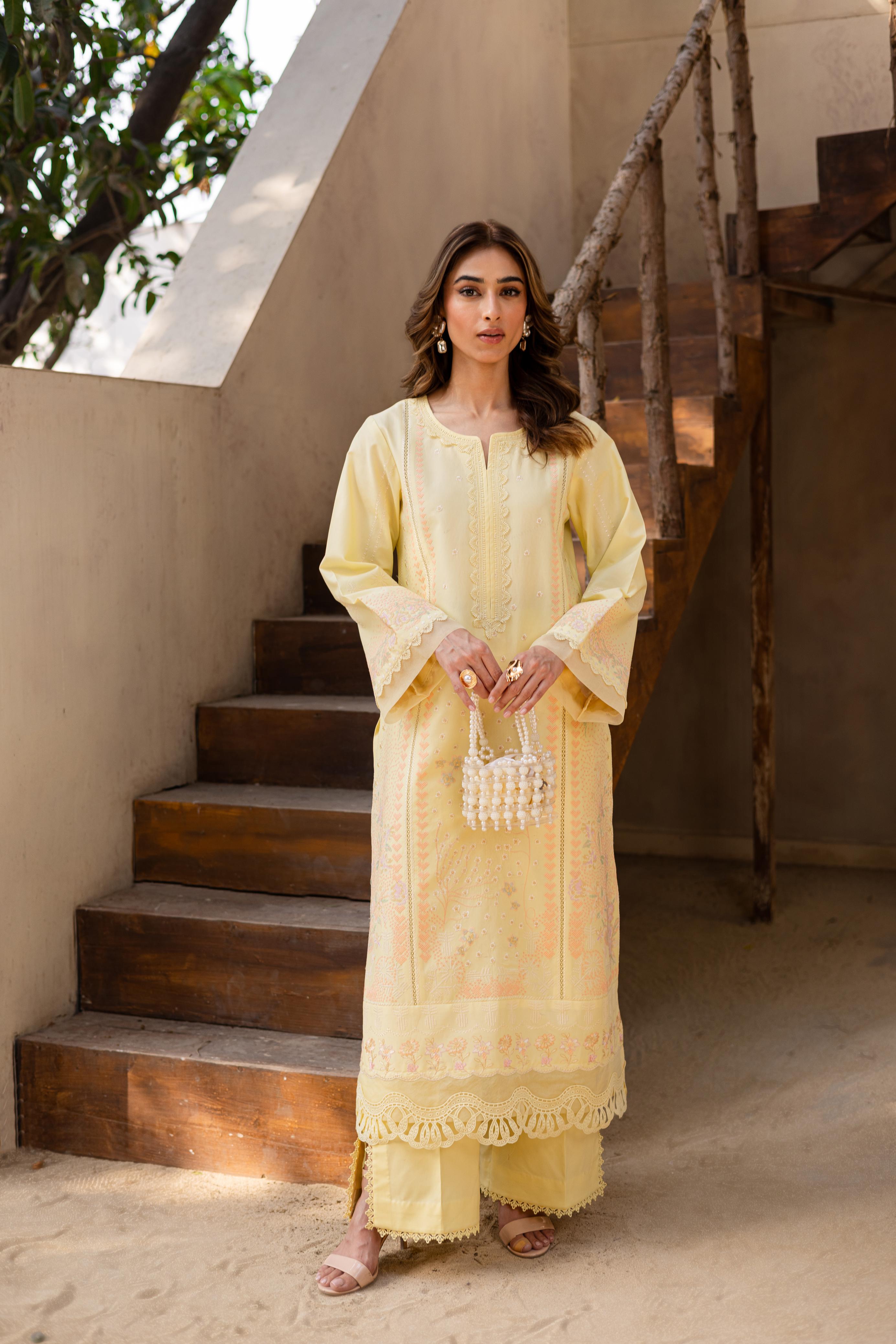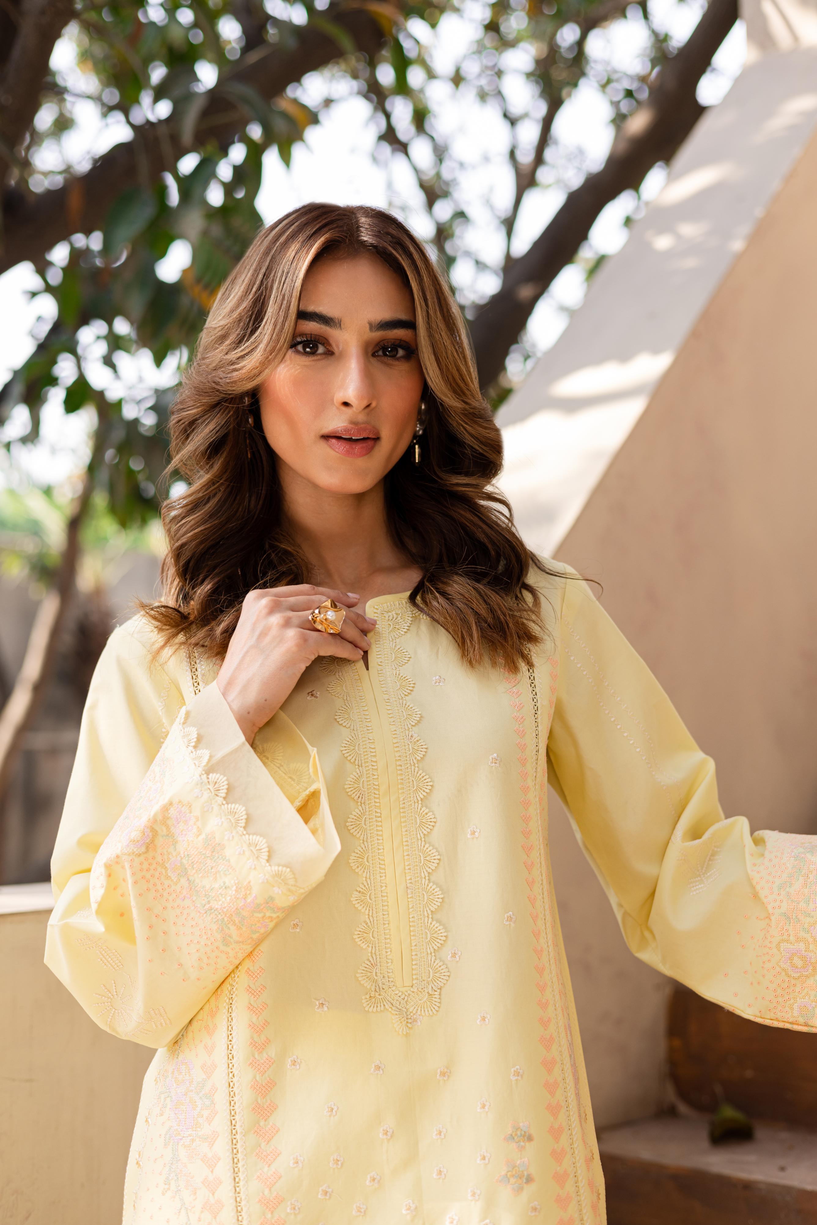 Bathed in the softness of lemon yellow, this embroidered lawn outfit captures the essence of summer bright, breezy, and beautifully balanced. Delicate threadwork in soft ivory and pastel tones graces the fabric like morning light, subtle yet striking. Paired with a matching embroidered chiffon dupatta that flows effortlessly and a coordinated trouser for a refined finish, this look is a gentle reminder that summer dressing can be both vibrant and serene.