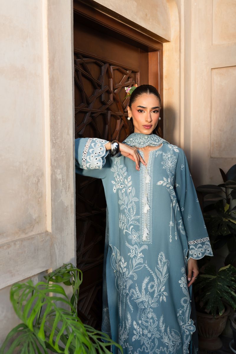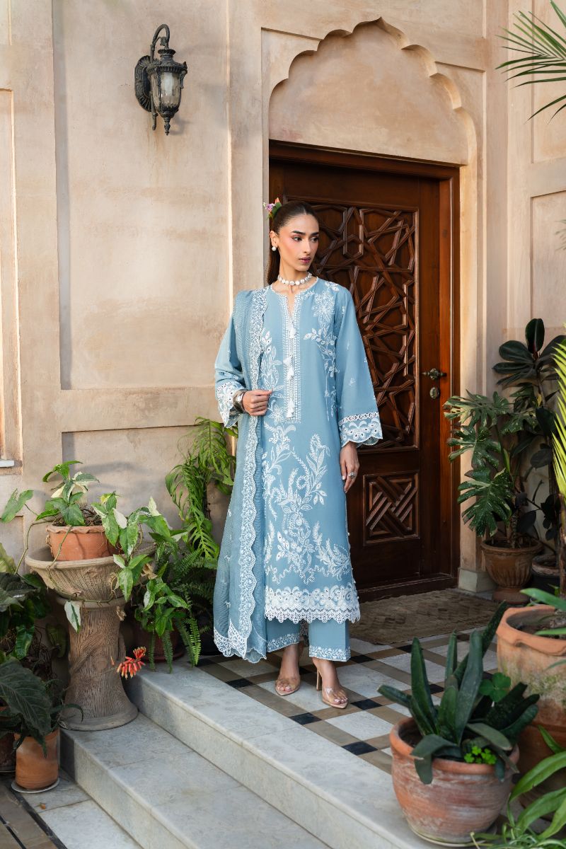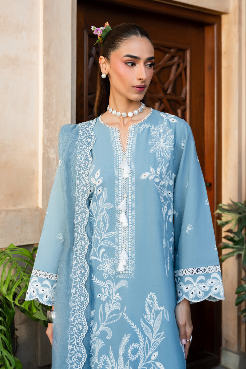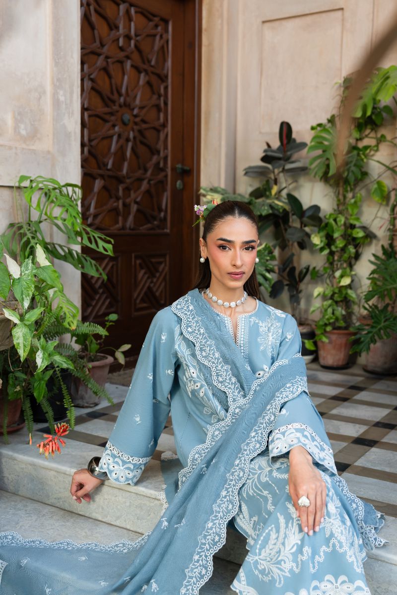 Mahira is crafted from Sky blue lawn featuring tonal resham embroidery inspired by French floral motifs. It is paired with a matching embroidered culottes pants and Khaadi net dupatta, elevating your summer evenings.