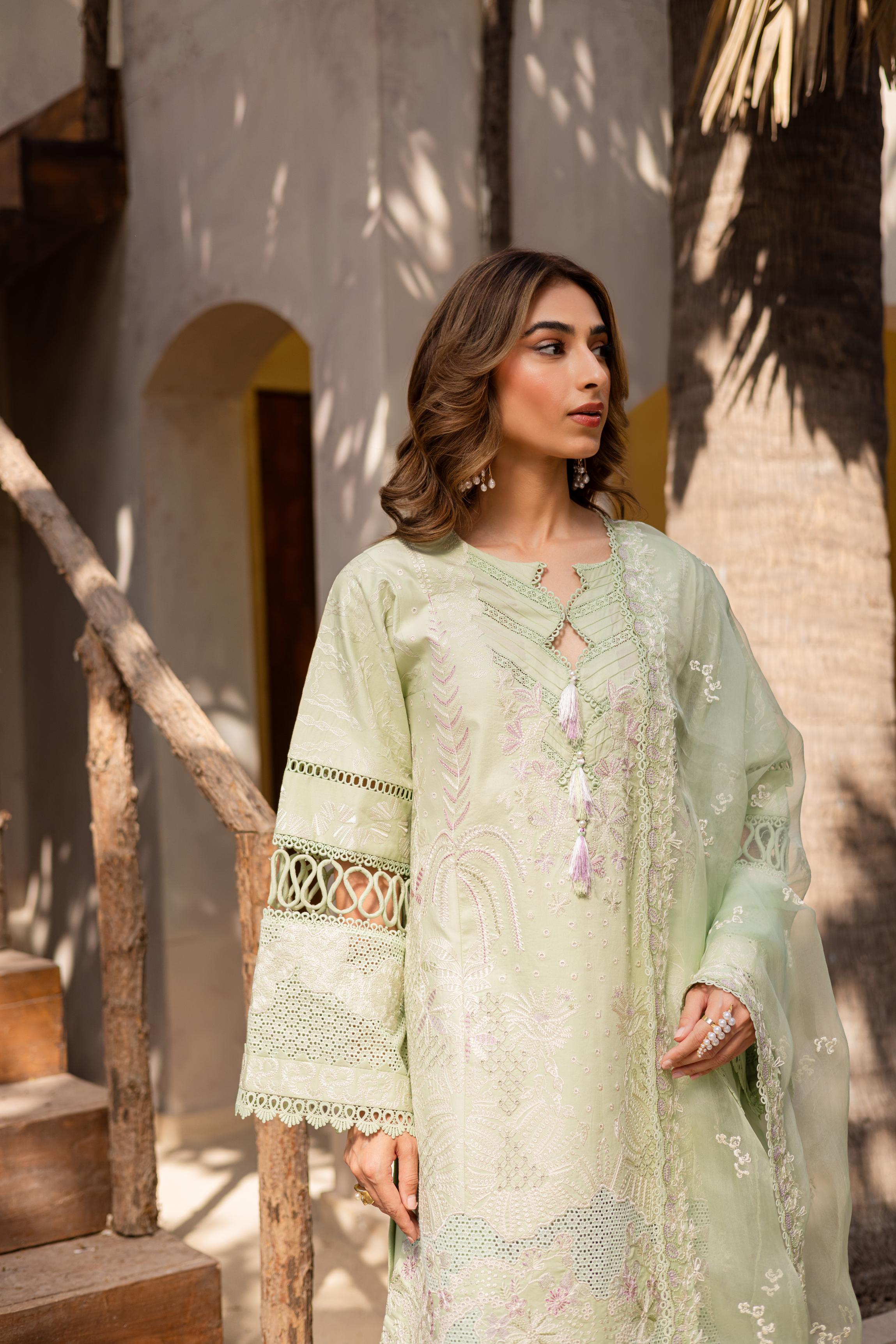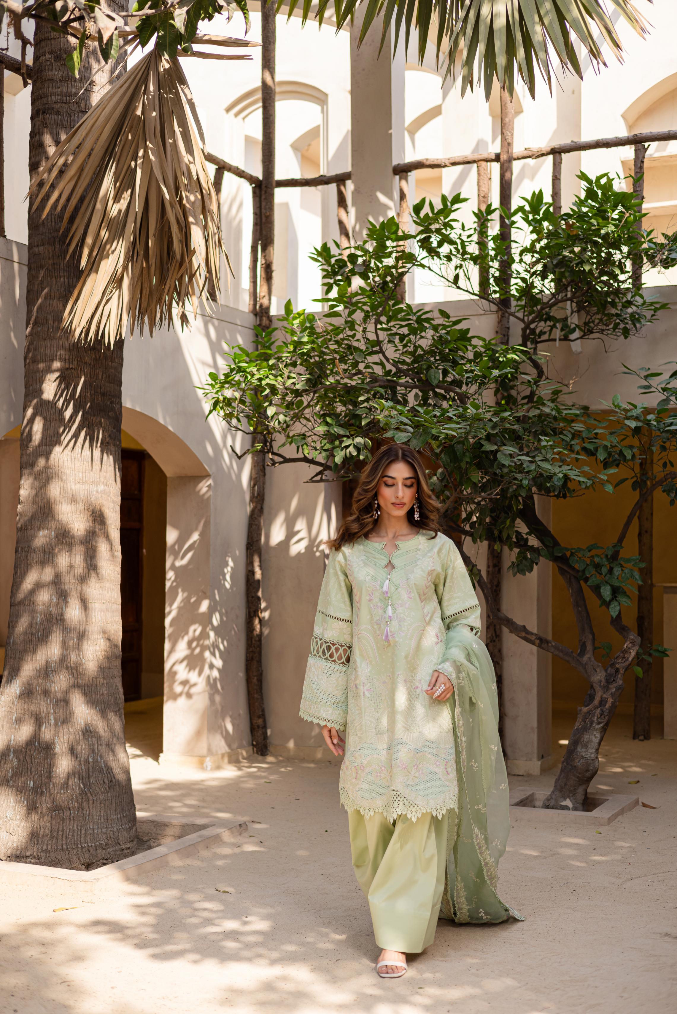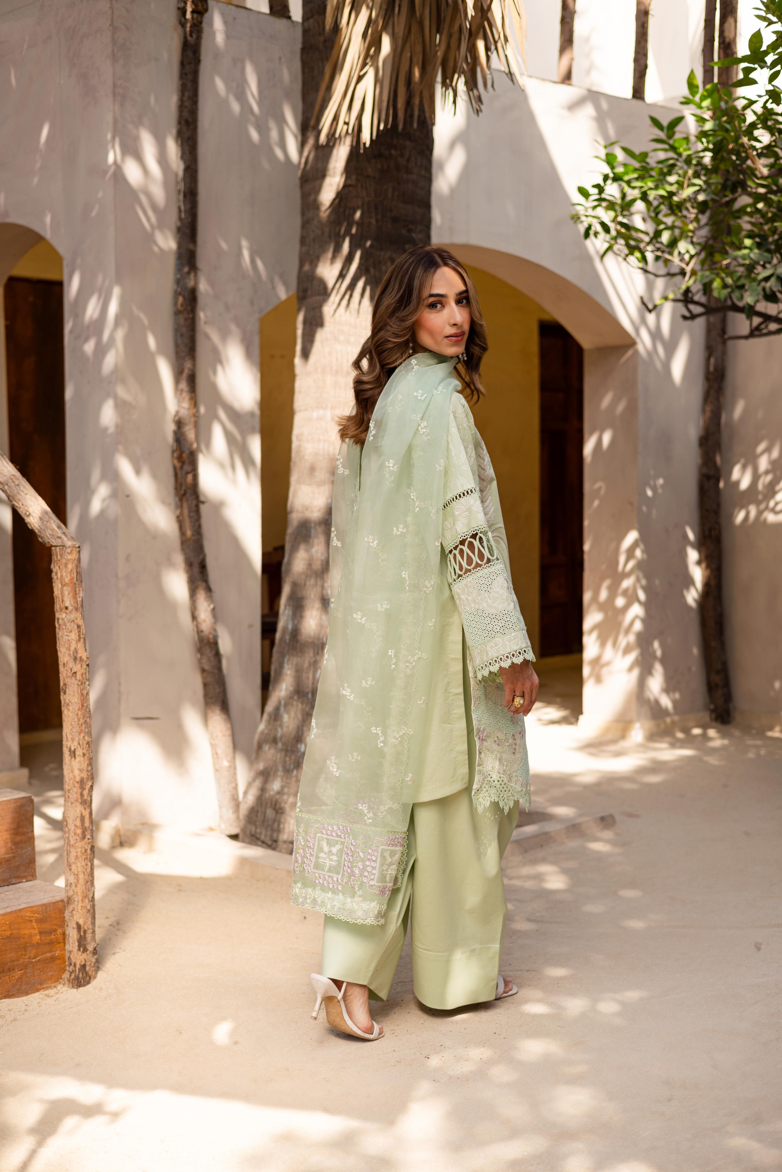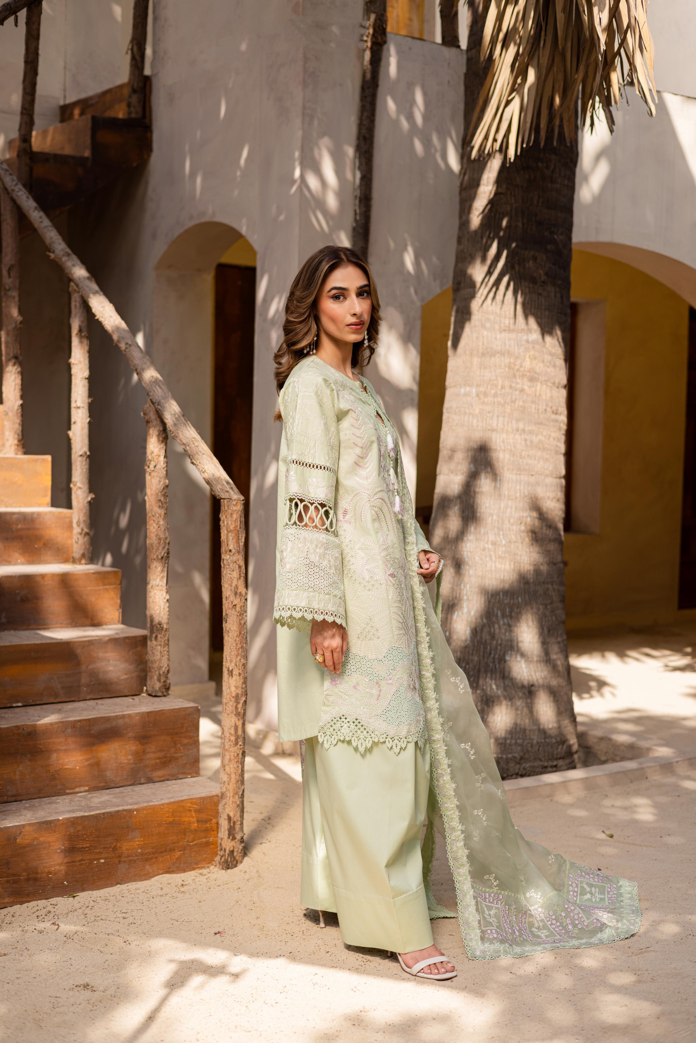 A refreshing ode to soft summer hues, this pistachio green lawn ensemble is adorned with intricate chikankari and delicate embroidery in white and lilac - a palette that whispers grace. The matching lawn trousers offer a seamless silhouette, while the embroidered organza dupatta in the same soothing shade adds a layer of lightness and charm.