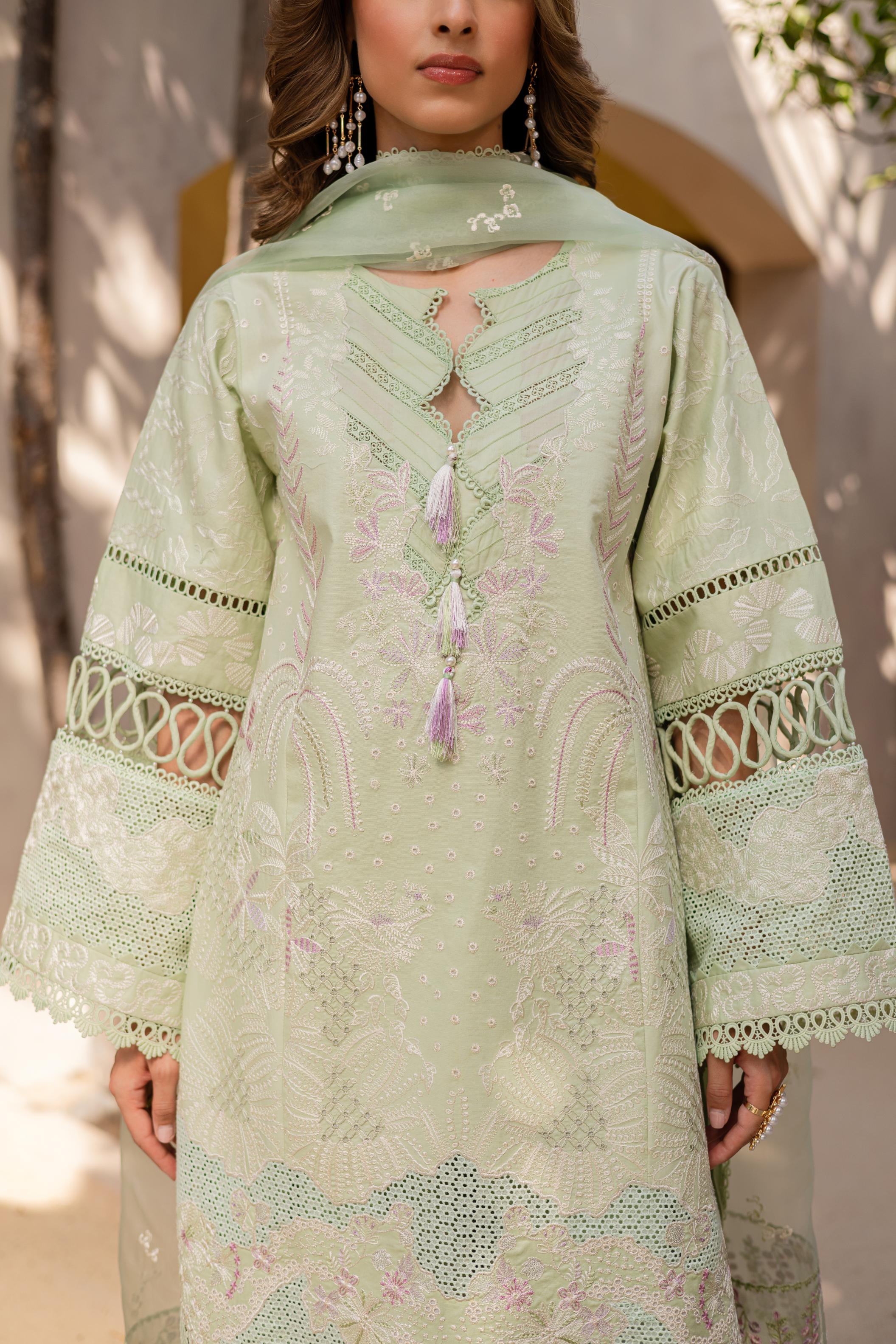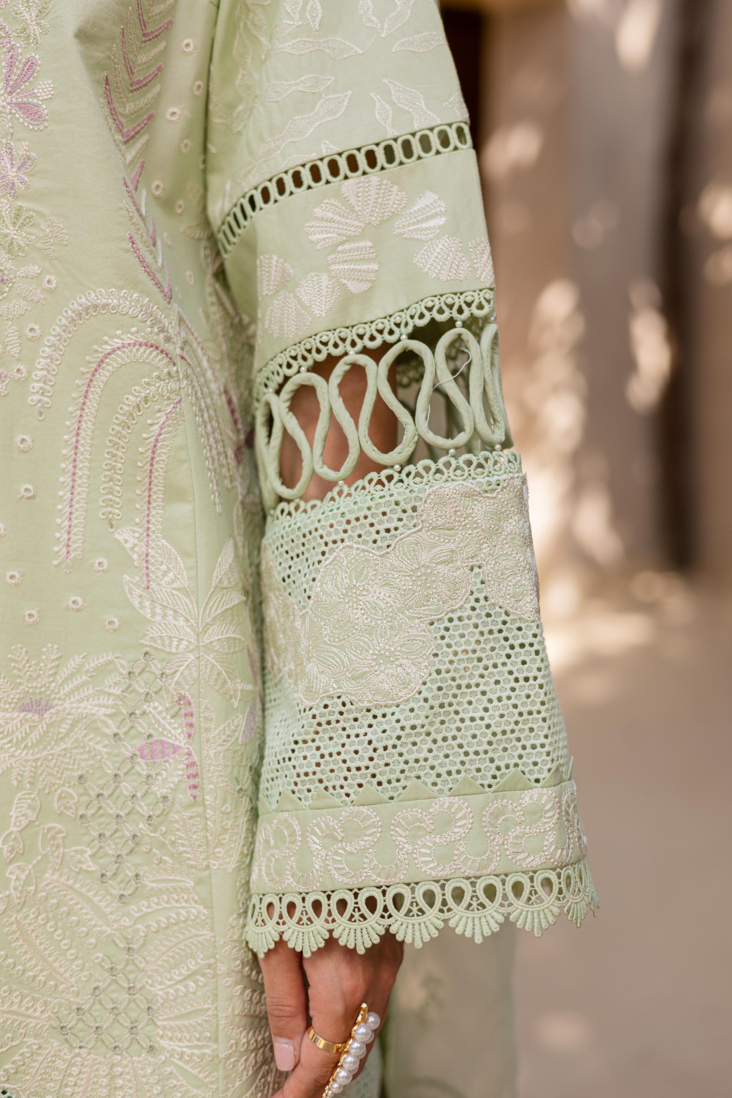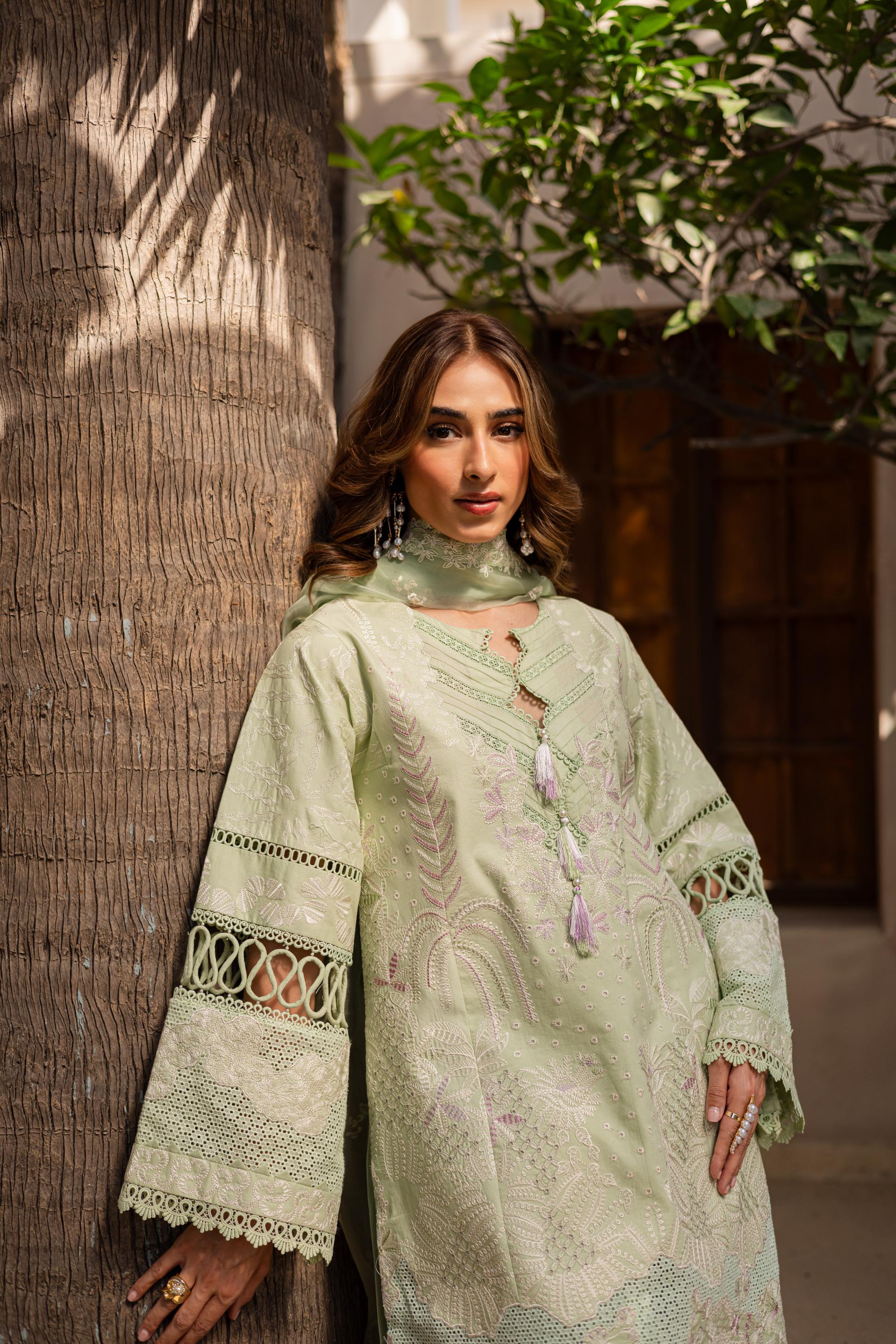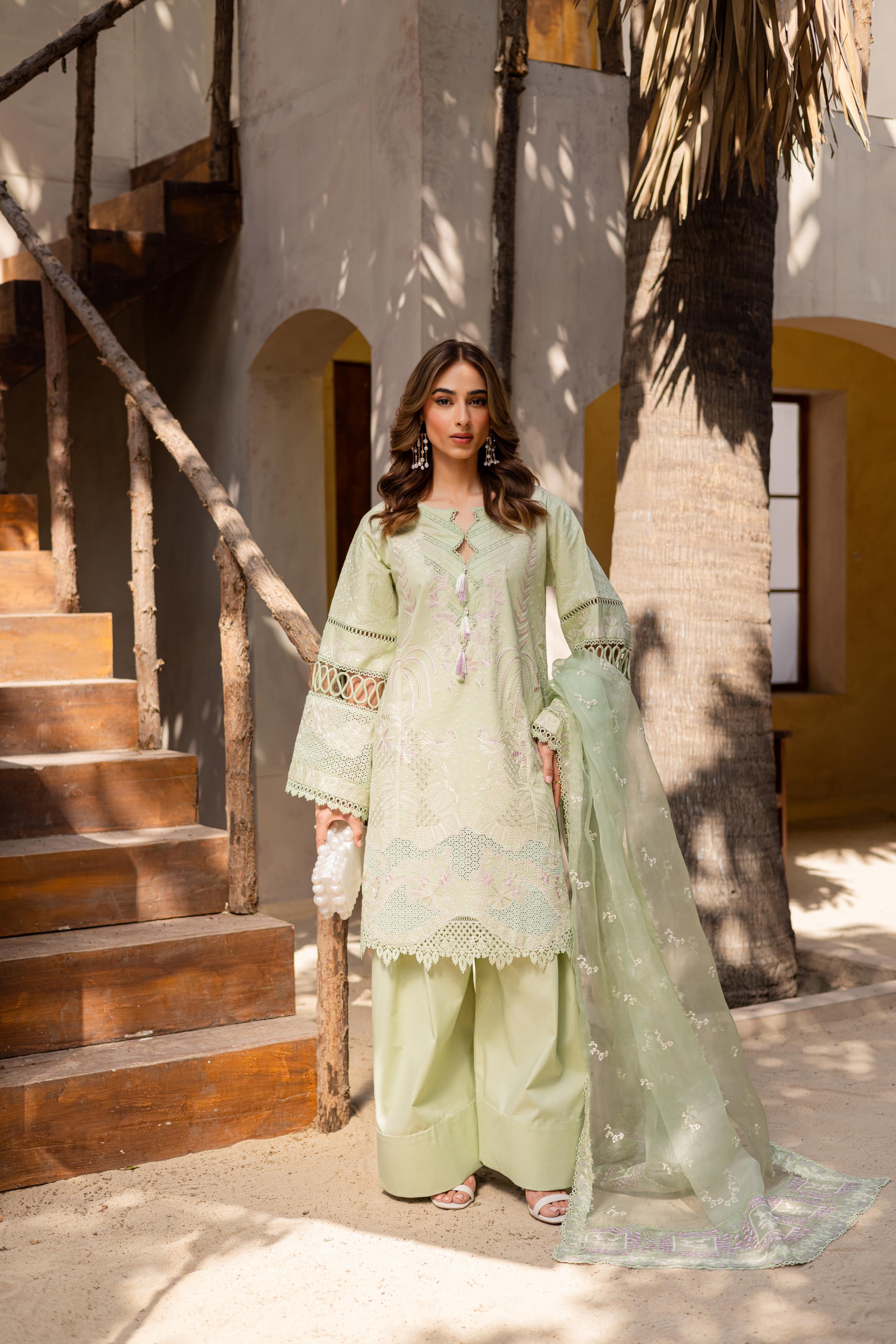 A refreshing ode to soft summer hues, this pistachio green lawn ensemble is adorned with intricate chikankari and delicate embroidery in white and lilac - a palette that whispers grace. The matching lawn trousers offer a seamless silhouette, while the embroidered organza dupatta in the same soothing shade adds a layer of lightness and charm.