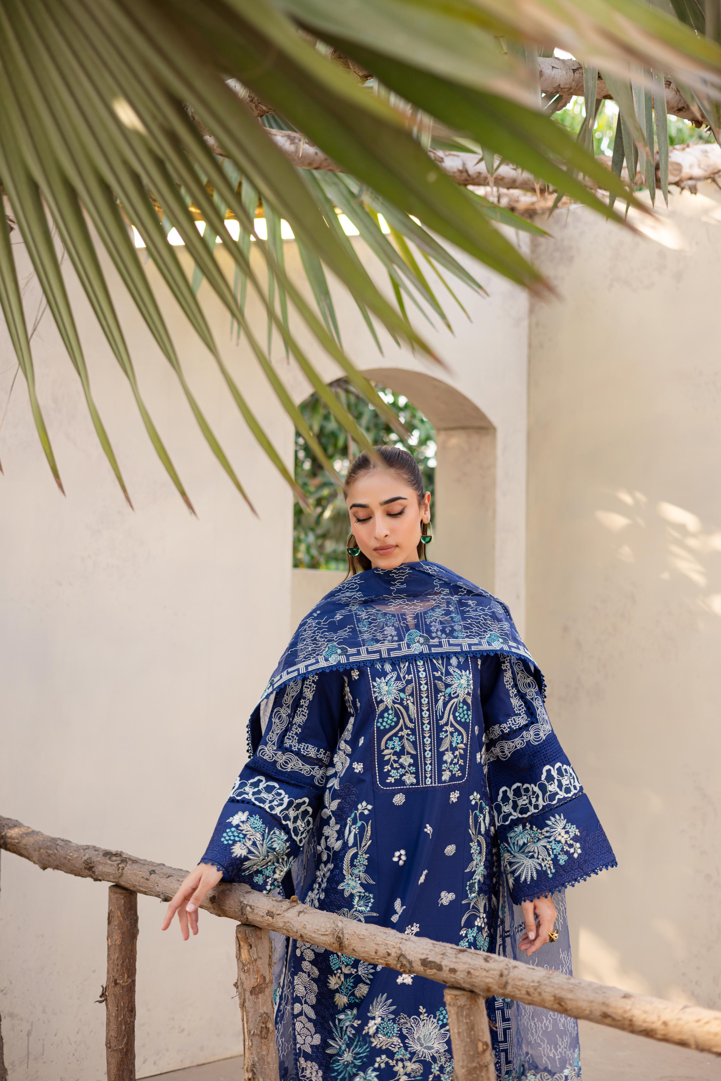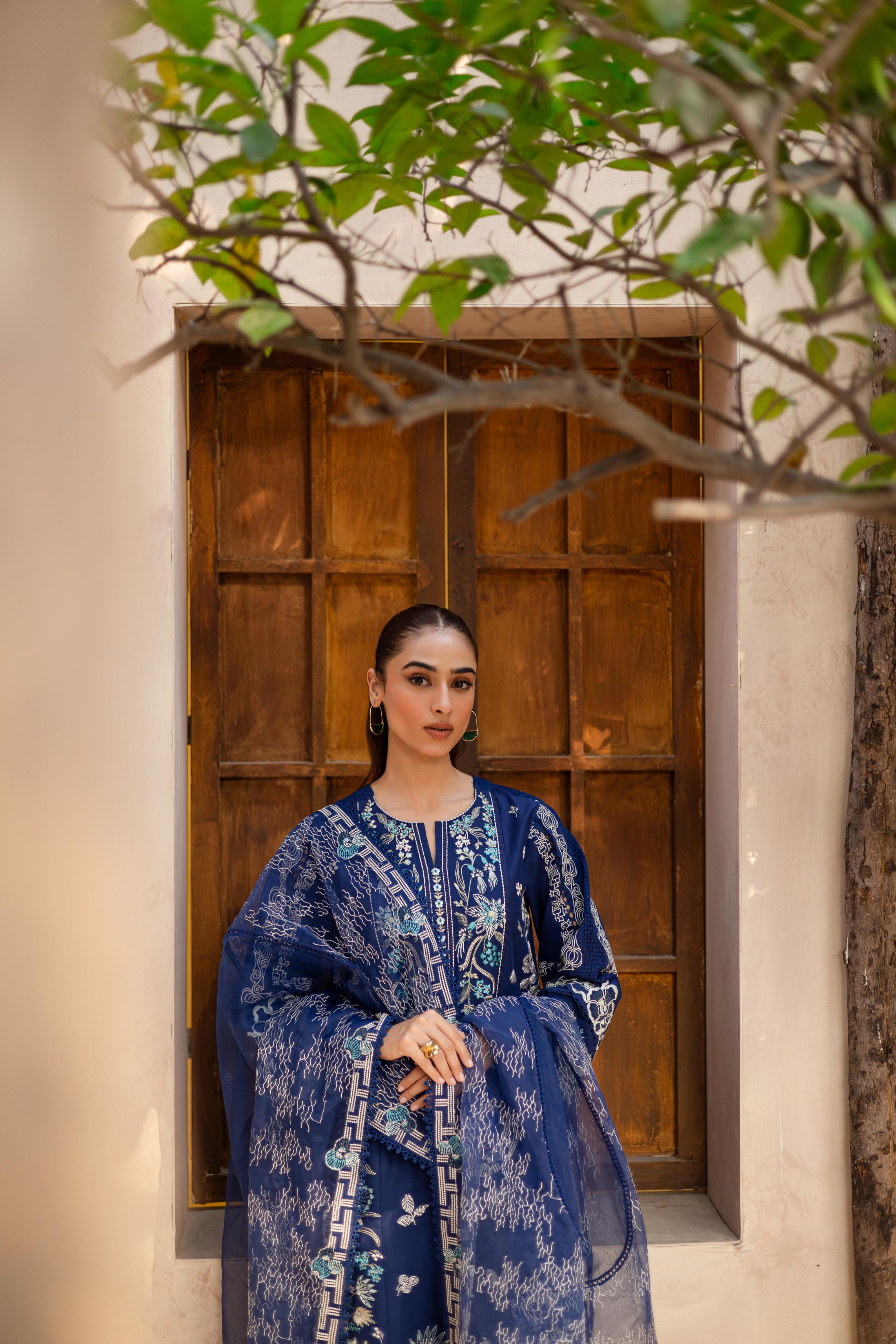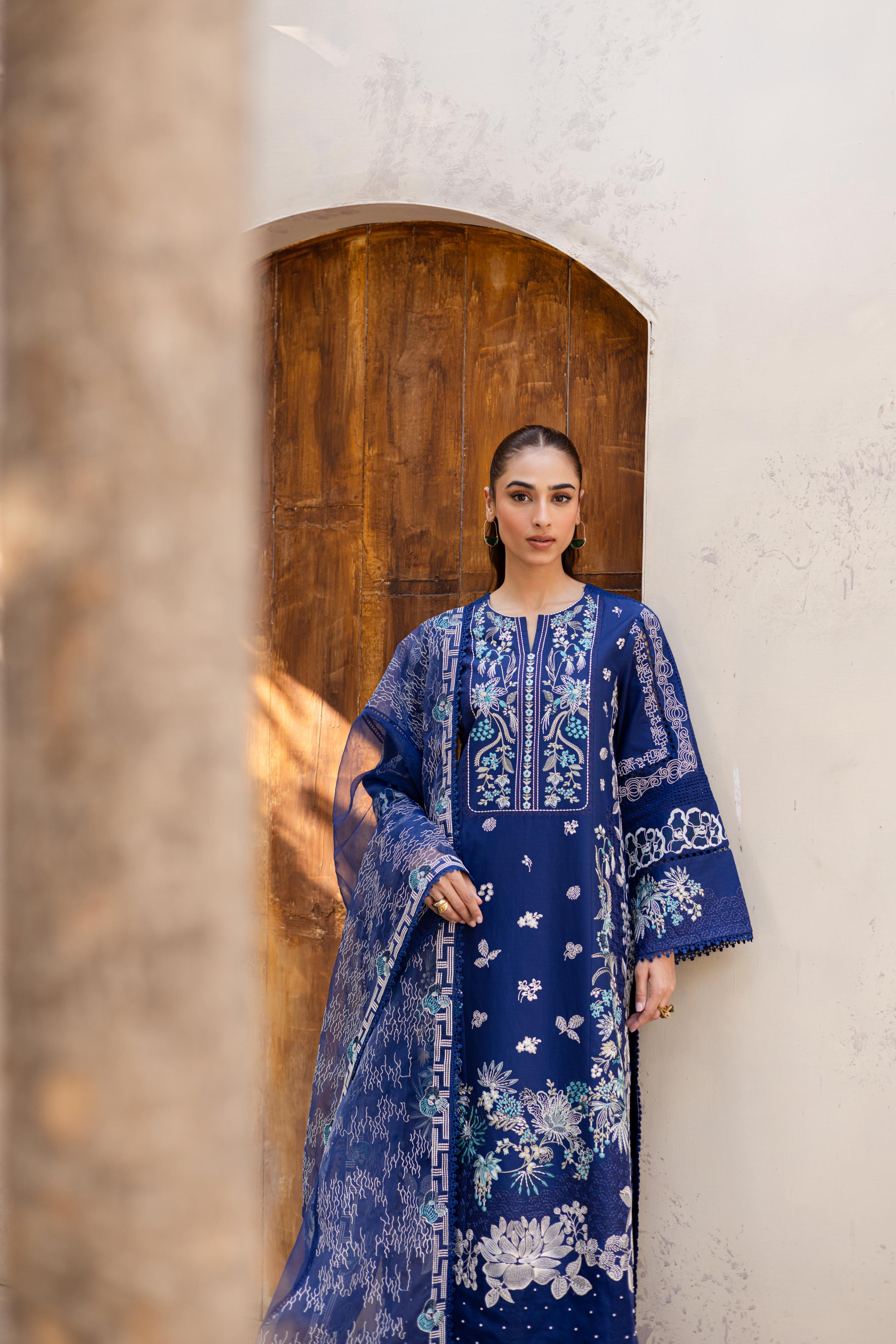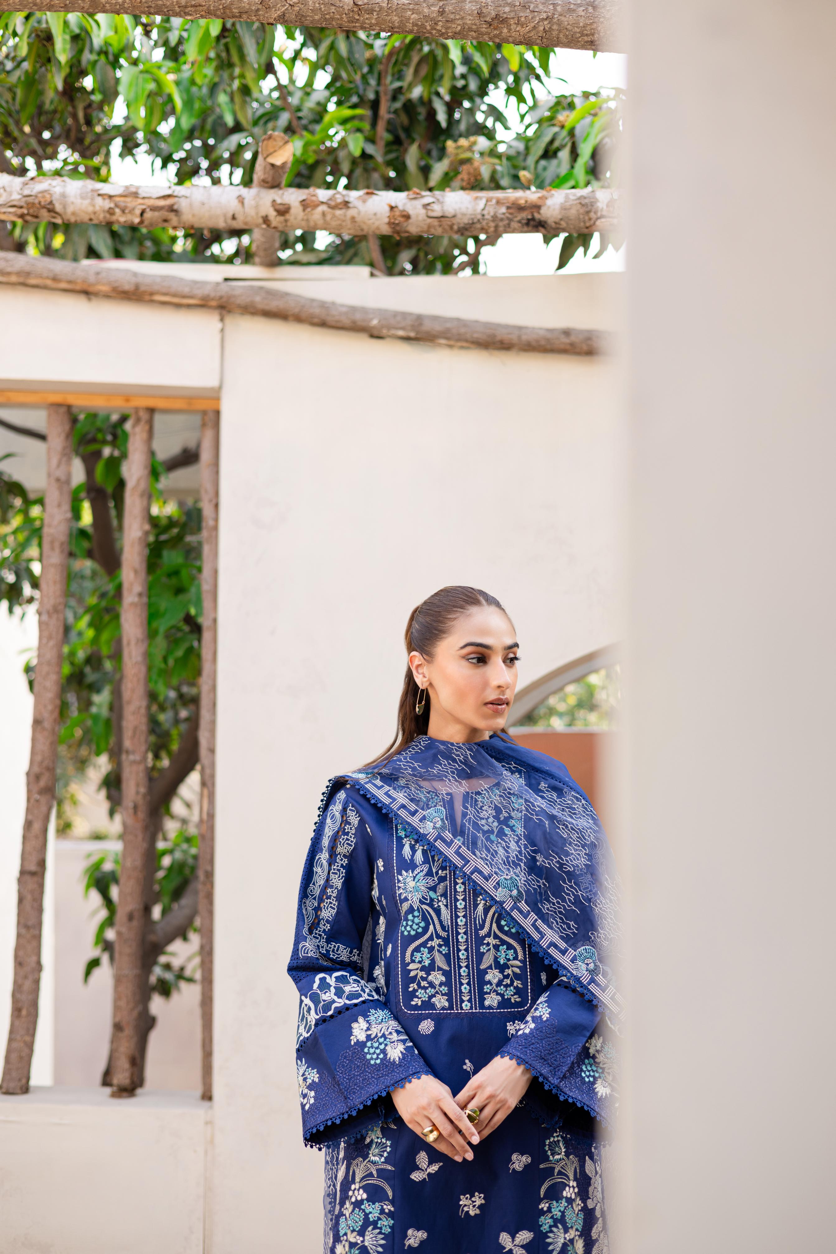 Rendered in navy blue, this lawn ensemble blends intricate chikankari with bold embroidery, creating a look that feels both composed and captivating. The matching embroidered organza dupatta adds a sheer layer of sophistication. Paired with coordinated trousers for a seamless finish, this outfit is effortlessly graceful.