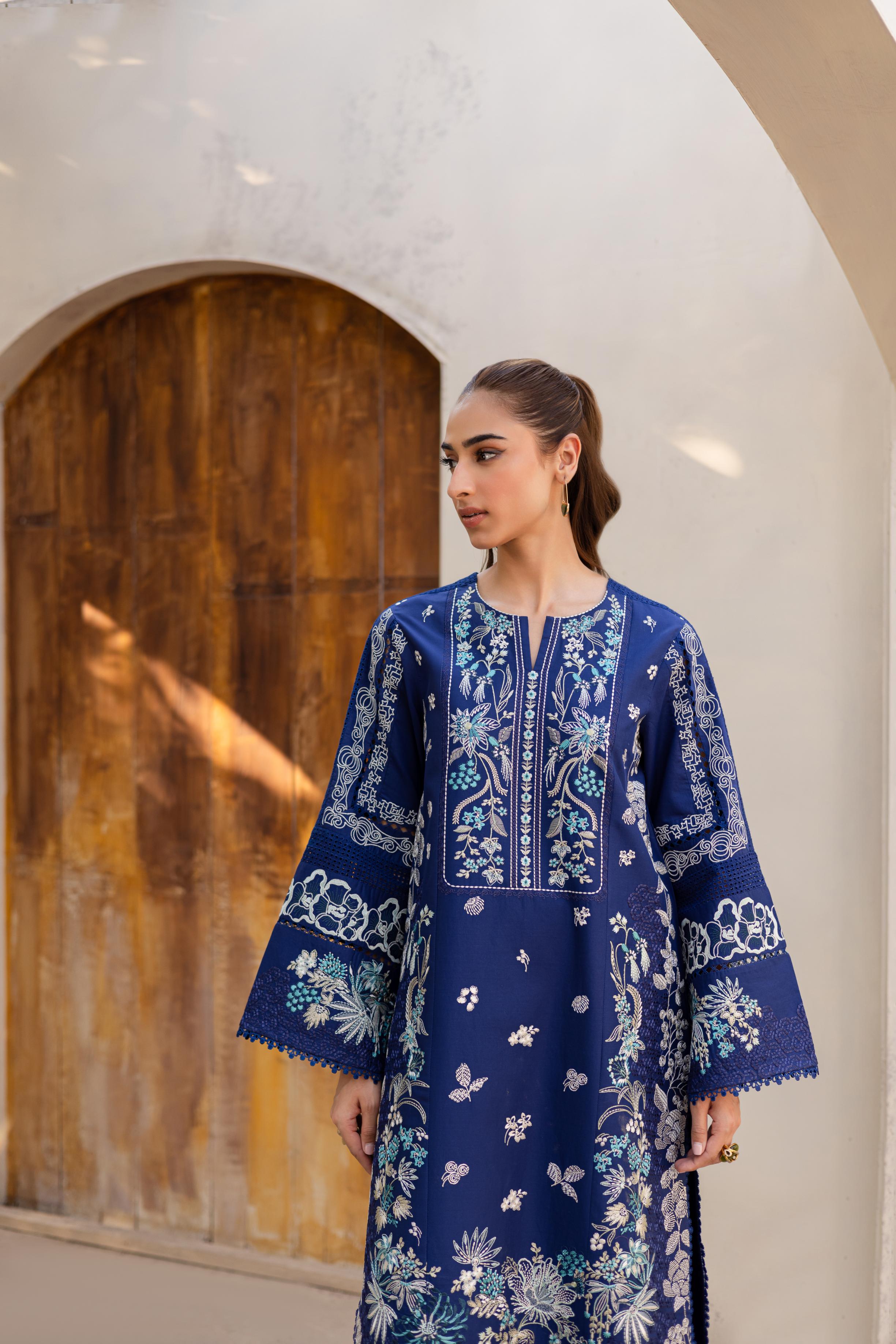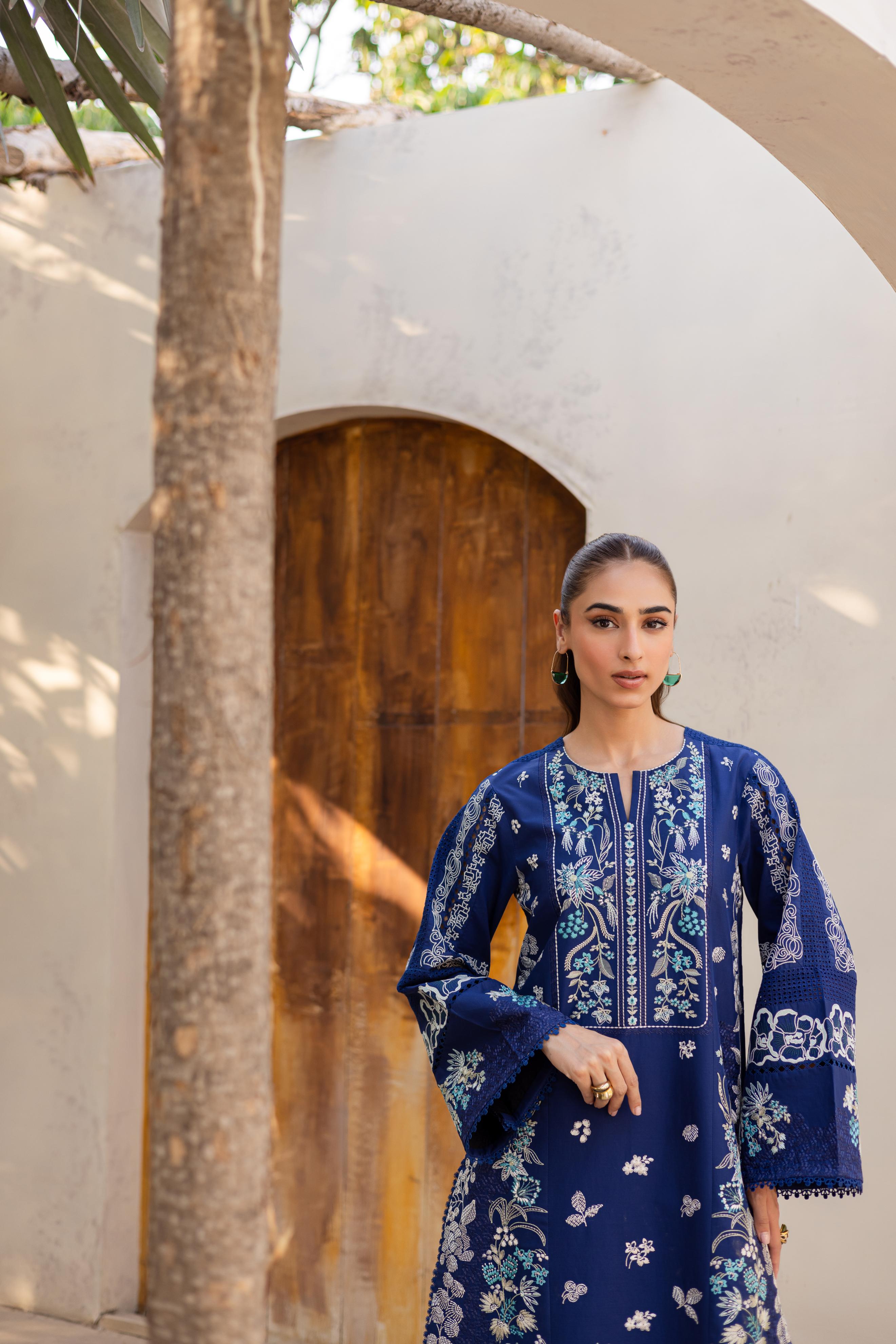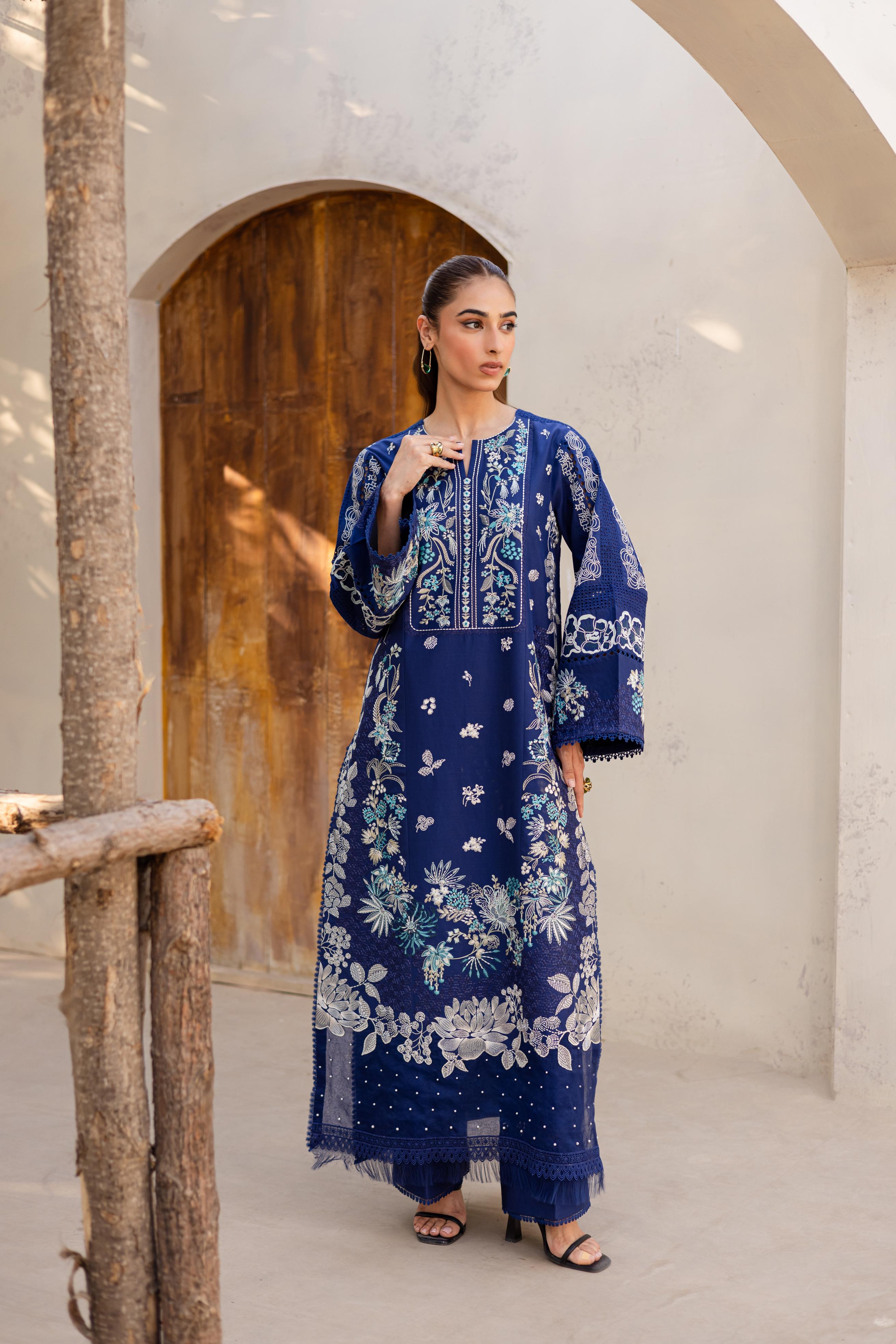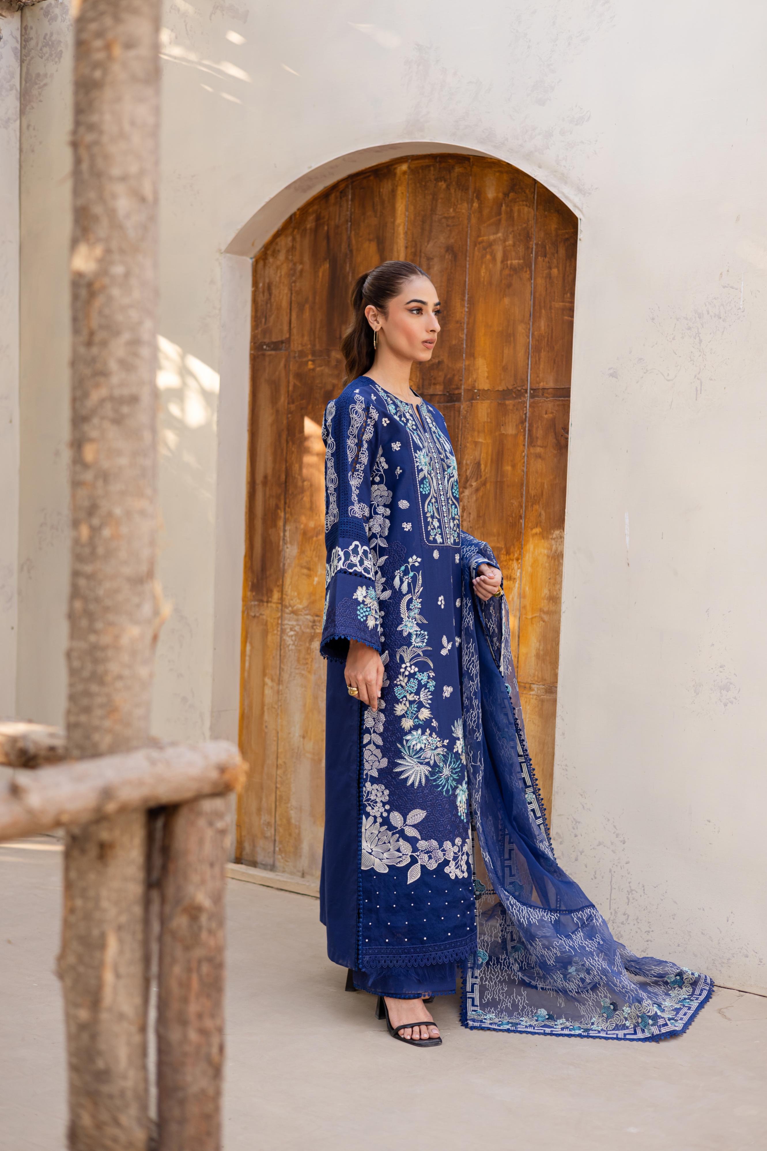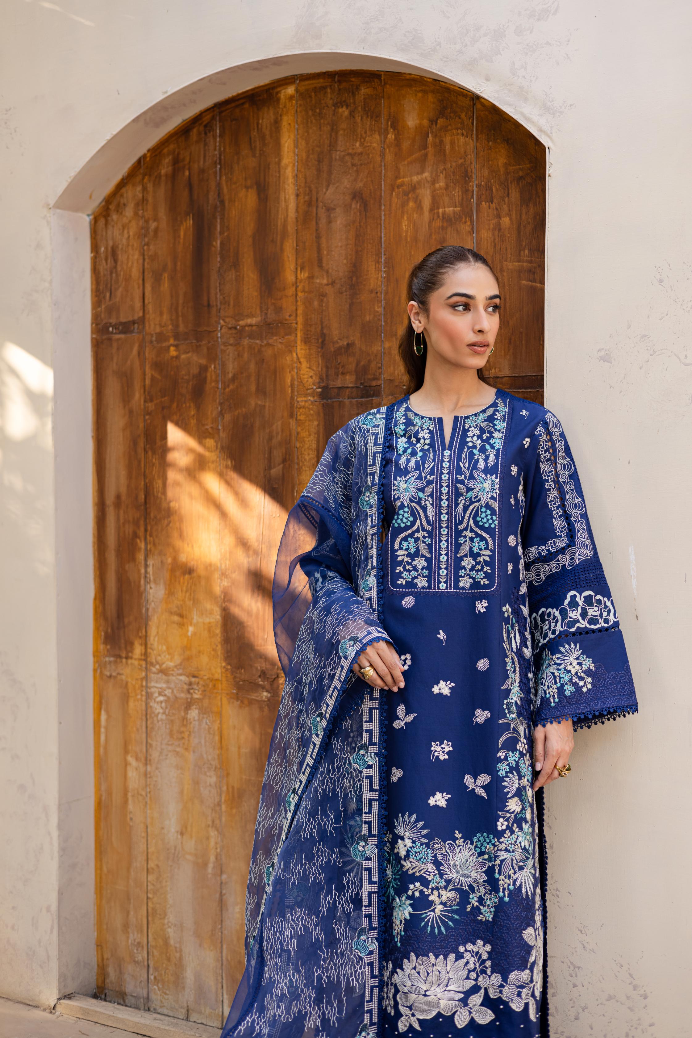 Rendered in navy blue, this lawn ensemble blends intricate chikankari with bold embroidery, creating a look that feels both composed and captivating. The matching embroidered organza dupatta adds a sheer layer of sophistication. Paired with coordinated trousers for a seamless finish, this outfit is effortlessly graceful.